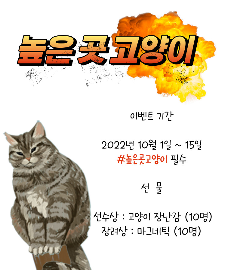 ✨ 참여 방법 ✨ '너만 없는 고양이' APP에서 참여 바로가기 (☞゚ヮ゚)☞ 참여하기 높은 곳에 올라간 고양이 사진 한장과 짧은 설명글 #높은곳고양이 해시태그 필수