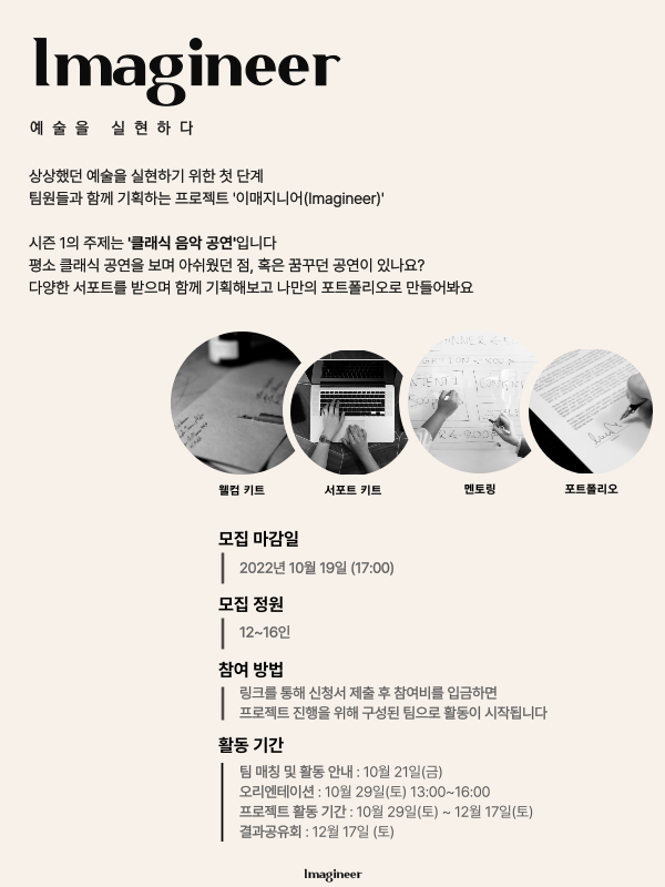 🎁 <이매지니어> 시즌 1에 참여하면 🖤 우리는 당신의 활동을 적극적으로 서포트할 거예요 하나의 클래식 공연 기획서가 완성될 수 있도록 3\~4인으로 팀 구성이 되며 공연 기획을 돕는 템플릿 키트와 담당 매니저의 밀착 관리, 현직자의 멘토링을 받을 수 있습니다
