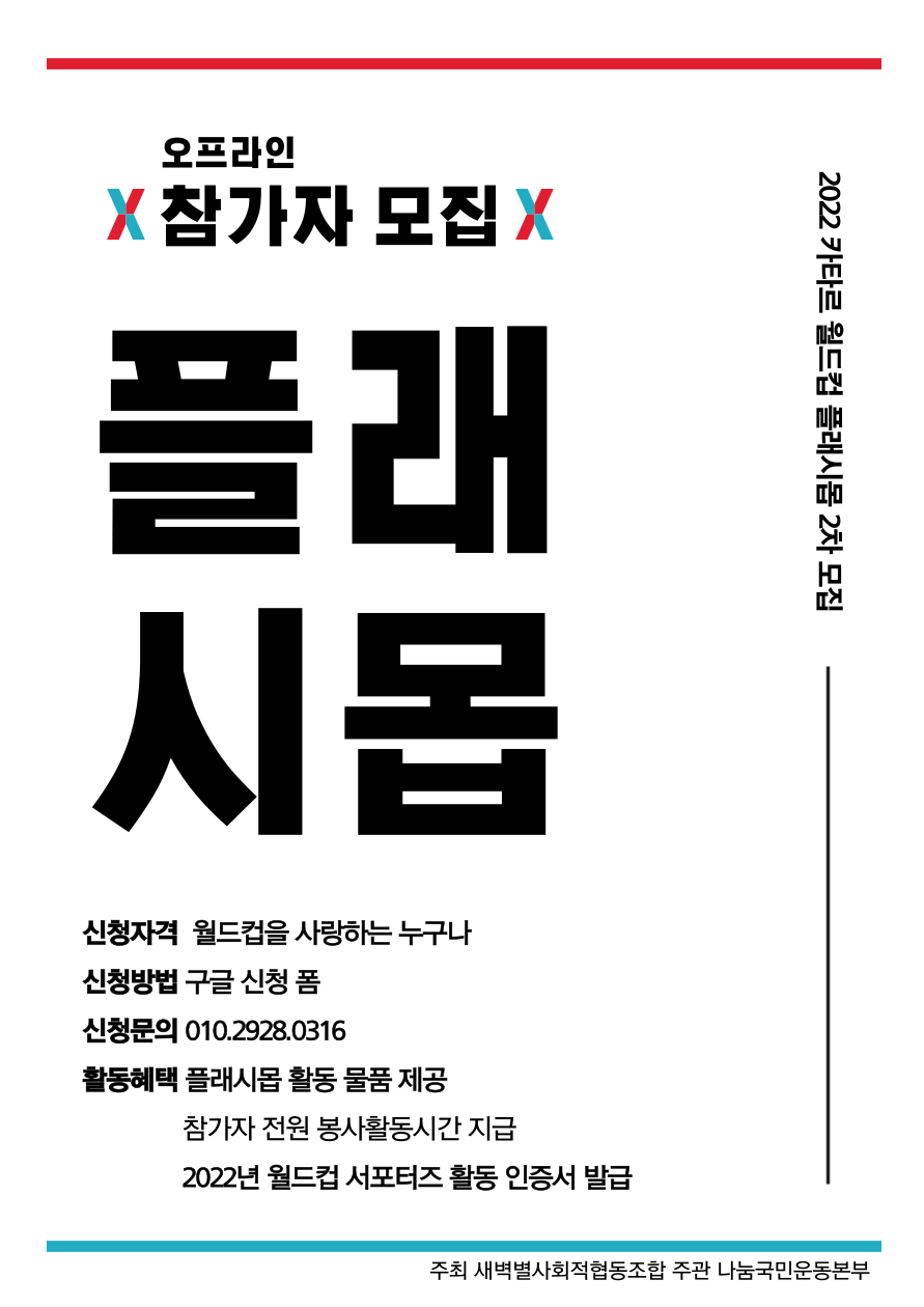 2022 카타르 월드컵을 맞이해 오프라인 플래시몹 서포터즈 2차 모집합니다! 새로운 월드컵 서포터즈님들과의 소중한 만남을 기다릴게요 ❤️