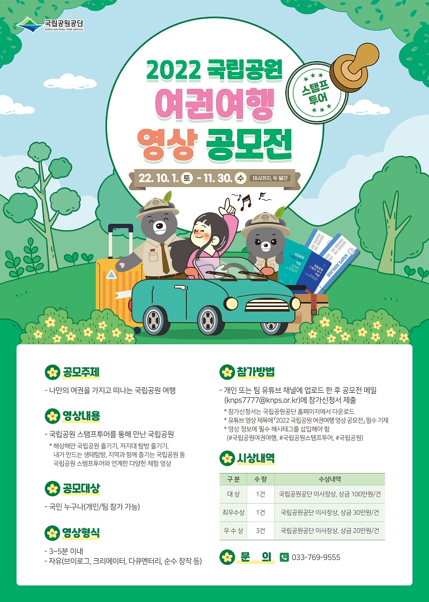 응모주제 - 나만의 여권을 가지고 떠나는 국립공원 여행 영상내용 - 국립공원 스탬프투어를 통해 만난 국립공원 * 해상해안 국립공원 즐기기, 저지대 탐방 즐기기, 내가 만드는 생태탐방, 지역과 함께 즐기는 국립공원 등 국립공원 스탬프투어와 연계한 다양한 체험 영상 응모자격 - 국민 누구나(개인/팀 참가 가능) 응모기간 - 접수기간 : 2022-10-01 \~ 2022-11-30 영상형식 - 3\~5분 이내 - 자유(브이로그\, 크리에이터\, 다큐멘터리\, 순수 창작 등) 참가방법 - 개인 또는 팀 유튜브 채널에 업로드 한 후 공모전 메일(knps7777@knps.or.kr)에 참가신청서 제출 * 참가신청서는 국립공원공단 홈페이지에서 다운로드 * 유튜브 영상 제목에 '2022 국립공원 여권여행 영상 공모전' 필수 * 영상 정보에 필수 해시태그를 삽입해야 함 (#국립공원여권여행, #국립공원스탬프투어, #국립공원) 시상내역 - 대상(1건) : 환경부장관상\, 상금 100만원/건 - 최우수상(1건) : 이사장상\, 상금 30만원/건 - 우수상(3건) : 이사장상\, 상금 20만원/건 문의사항 - 033-769-9555