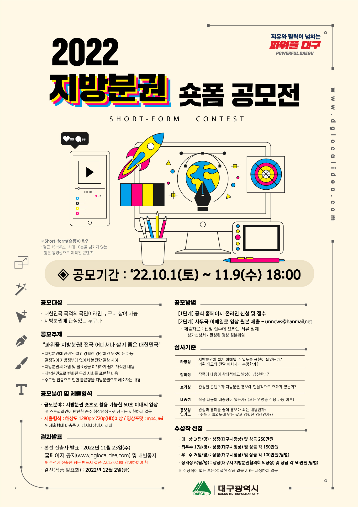 - 장려상 6팀(명) : 대구시 지방분권협의회 의장상 및 상금 각 50만원(팀별)