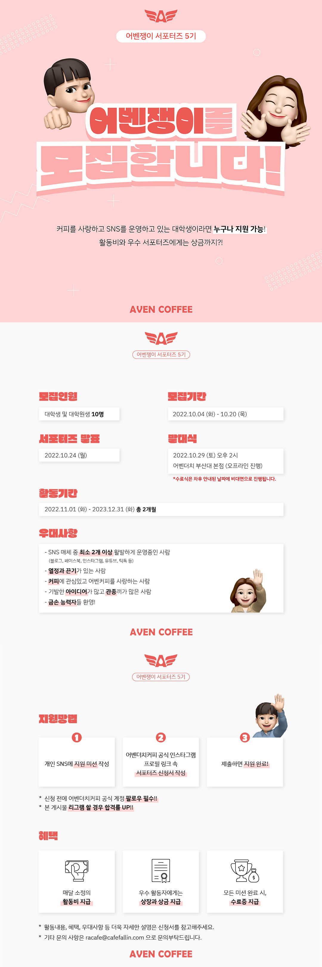 - 지원 미션 : 어벤커피 매장을 이용하고 후기 게시물을 작성 후 설문지에 링크 첨부