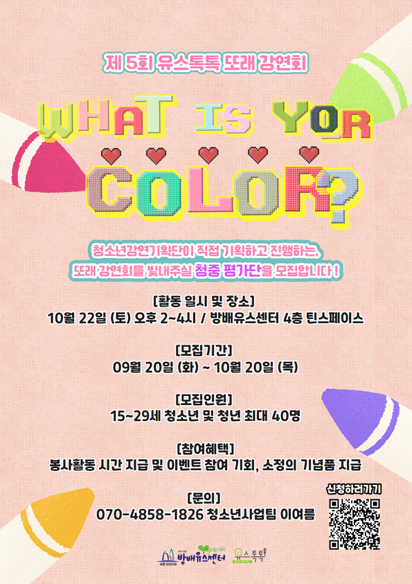 2022년 10월! 🎨What is your color? 🎨 또래 강연자들의 경험, 교훈 등 다채로운 이야기가 여러분을 기다립니다! 방명록을 작성하면 포토존에서 예쁜 사진과 폴꾸를 할 수 있는 물품들을 제공해드리며, 청중평가단을 위한 기념품과 봉사시간이 지급됩니다!