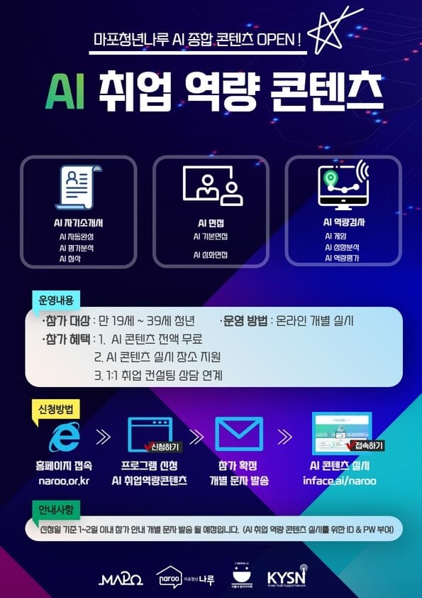 ▶실시 방법: 마포청년나루 홈페이지 AI 취업 역량 콘텐츠 신청 → 개별 안내 문자 발송(개인 접속 ID & PW 부여) → 신청 당월 말일까지 AI 콘텐츠 자유롭게 이용