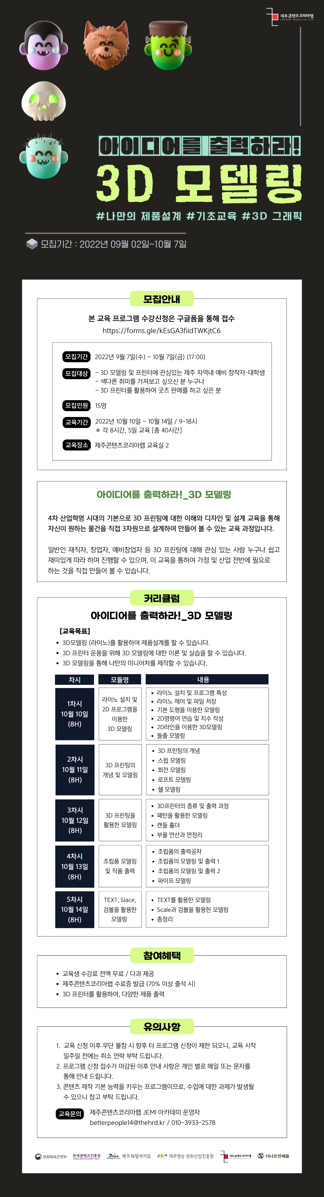 3D 모델링에 관심있는 창작자·대학생, 3D 프린터를 활용해 굿즈를 만들고 싶으신 제주도민이라면 누구나 신청 가능합니다!