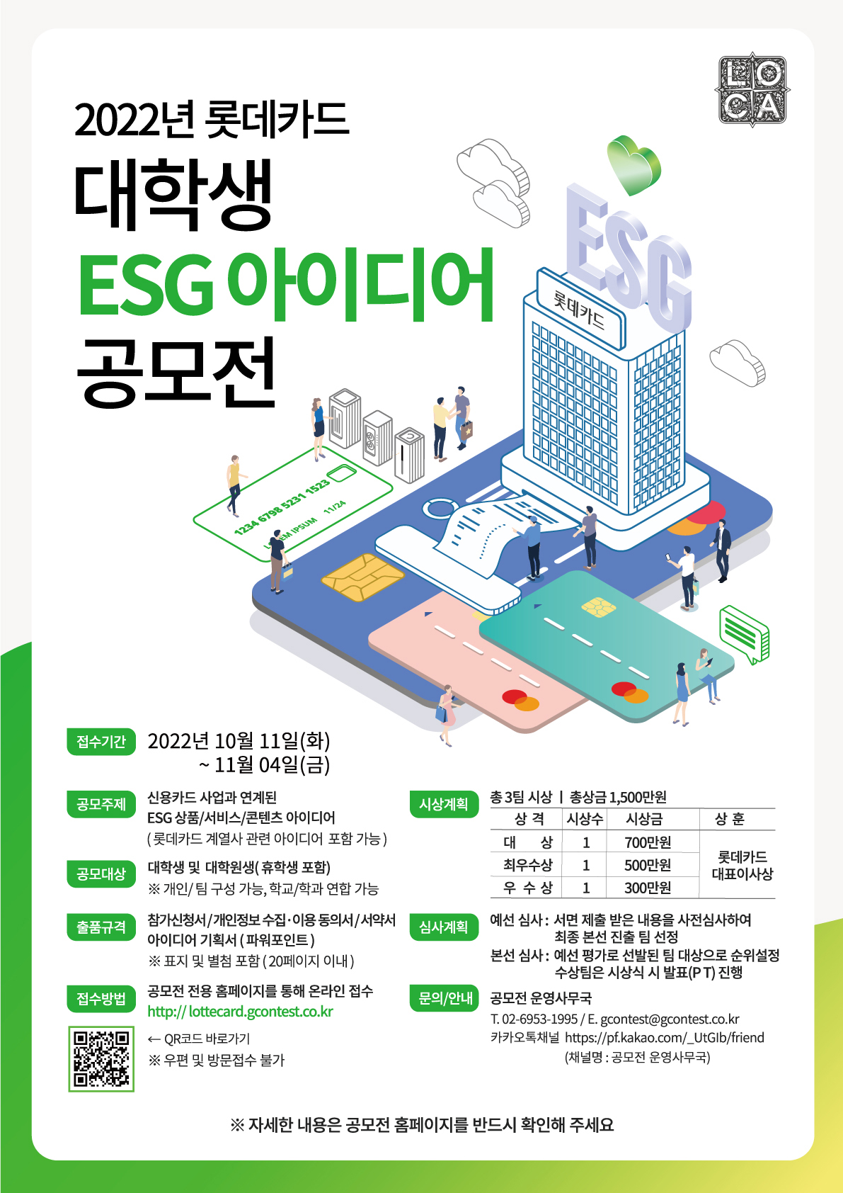 ■ 응모 주제 - 신용카드 사업과 연계된 ESG 상품 / 서비스 /콘텐츠 아이디어 - 다른 사업군과 차별화된 신용카드사다운 ESG아이디어 - 롯데카드 2개 계열사(베트남 법인\, 로카모빌리티) 관련 아이디어 포함 가능 ■ 시상 내역 - 대 상 1명 700만원\, 상훈 롯데카드(주) 대표이사 - 최우수상 1명 500만원, 상훈 롯데카드(주) 대표이사 - 우 수 상 1명 300만원, 상훈 롯데카드(주) 대표이사