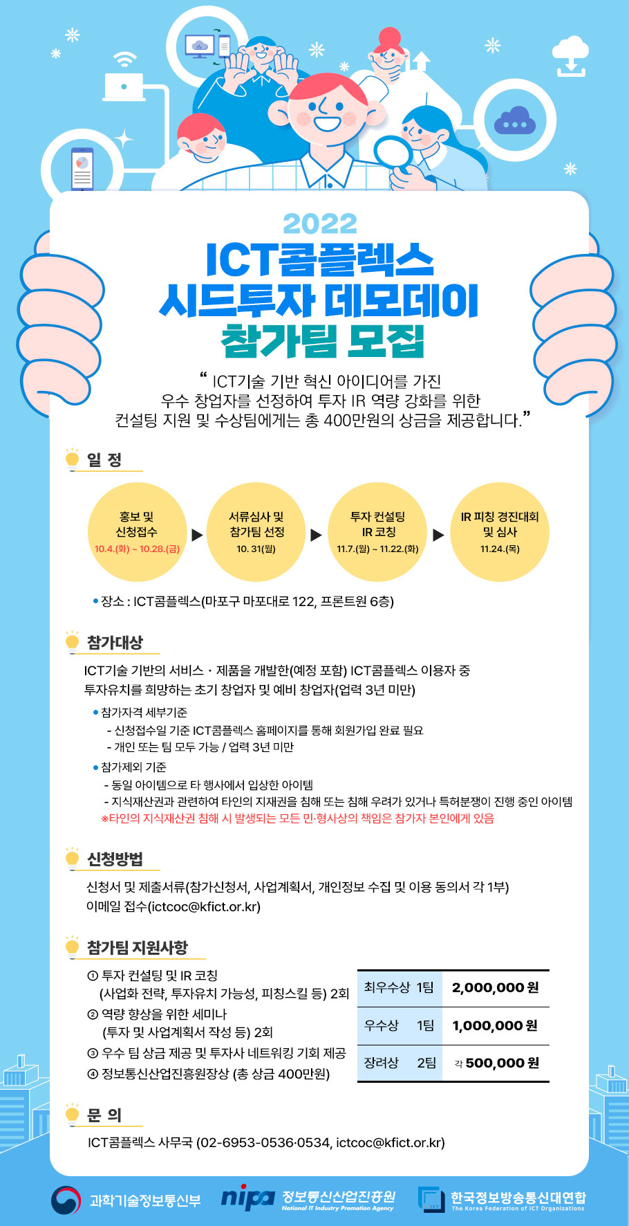 * ICT콤플렉스 홈페이지 공고문 내 첨부파일 다운로드 후 작성 https://www.ictcoc.kr/04_com_n/com02_view.asp?idx=636 *지식재산권 등록증은 서류심사 통과자에 한하여 제출 - 참가신청 기간 : 2022. 10. 4.(화) \~ 10. 28.(금) 24:00 - 서류심사 결과 발표 : 2022. 10. 31(월) ※ 개별 통보 예정 2. 일정 - 투자 컨설팅 IR 코칭 : 2022. 11. 7.(월) \~ 11. 22.(화) - IR 피칭 경진대회 및 심사 : 2022. 11. 24.(목) * 장소 : ICT콤플렉스(마포구 마포대로 122, 프론트원 6층) - 지원 사항 > 투자 컨설팅 및 IR 코칭(사업화 전략, 투자유치 가능성, 피칭스킬 등) 2회 > 역량 향상을 위한 세미나(투자 및 사업계획서 작성 등) 2회 > 우수 팀 상금 제공 및 투자사 네트워킹 기회 제공 3. 시상 * 정보통신산업진흥원장상 (총 상금 400만원) - 최우수상 1팀 : 2,000,000원 - 우수상 1팀 : 1,000,000원 - 장려상 2팀 : 500,000원 4. 문의 - ICT콤플렉스 사무국 (02-6953-0536·0534, ictcoc@kfict.or.kr)