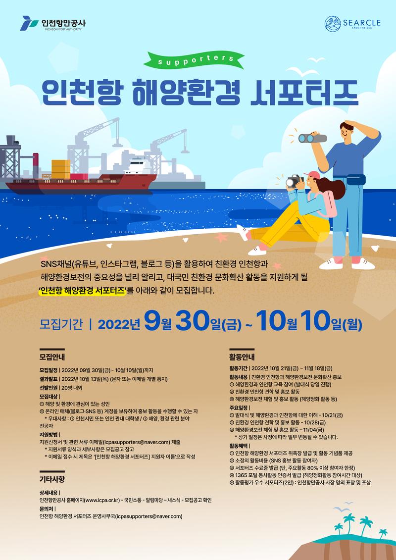 SNS채널(유튜브, 인스타그램, 블로그 등)을 활용하여 친환경 인천항과 해양환경보전의 중요성을 널리 알리고, 대국민 친환경 문화확산 활동을 지원하게 될 ‘인천항 해양환경 서포터즈’를 아래와 같이 모집합니다. ㅇ 접수기간 : 2022년 9월 30일(금) \~ 10월 12일(월) ㅇ 활동기간 : 2022년 10월 21일(금) \~ 11월 18일(금) ㅇ 활동사항 : 친환경 인천항과 해양환경보전 문화확산 홍보 ㅇ 모집인원 : 20명 내외 ㅇ 신청방법 : 지원신청서 및 관련 서류 이메일 제출 (icpasupporters@naver.com) - 이메일 접수 시 제목은 ‘[인천항 해양환경 서포터즈] 지원자 이름’으로 작성 자세한 사항은 모집공고 포스터 및 붙임 파일을 참고하여 주시기 바랍니다. 끝.