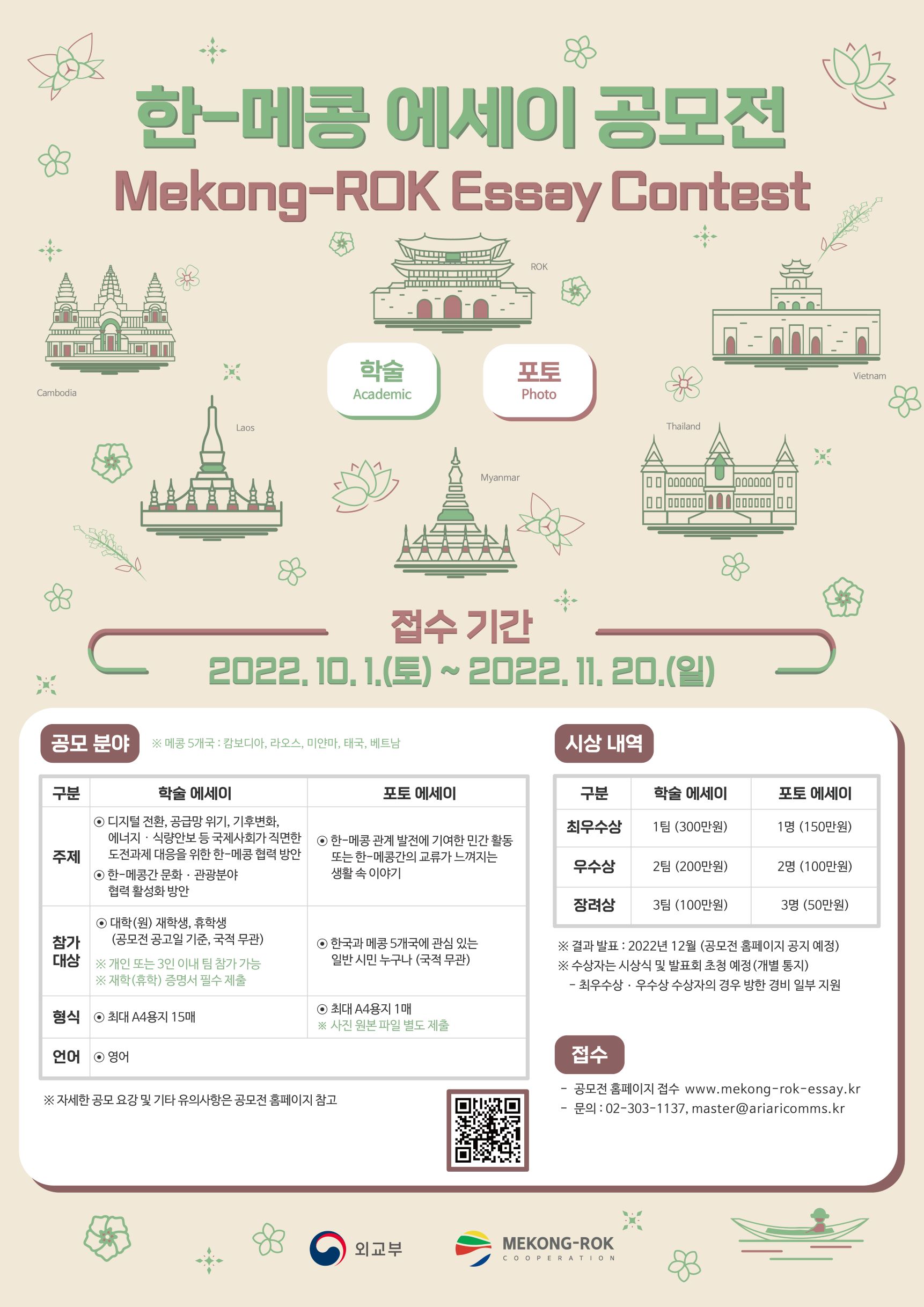 ■공모일정 - 접수 기간 : 2022. 10. 1.(토) 12:00 \~ 2022. 11. 20.(일) 24시 - 심사 : 2022. 11. - 결과 발표 : 2022. 12. 초 (공식 홈페이지 공지 예정) - 시상식 및 발표회 : 2022. 12. 말 (개별 통지 예정) ■ 공모주제 ① 학술에세이 - 디지털 전환\, 공급망 위기\, 기후변화\, 에너지・식량안보 등 국제사회가 직면한 도전과제 대응을 위한 한-메콩 협력 방안 - 한-메콩간 문화・관광 분야 협력 활성화 방안 ② 포토에세이 - 한-메콩 관계 발전에 기여한 민간 활동 또는 한-메콩간의 교류가 느껴지는 생활 속 이야기 ■ 참가대상 ① 학술에세이 - 대학(원) 재학생\, 휴학생(공모전 공고일 기준\, 국적무관) ※ 개인 또는 3인 이내 팀 참가 가능 ② 포토에세이 -한국과 메콩 5개국에 관심 있는 일반 시민 누구나(국적무관)