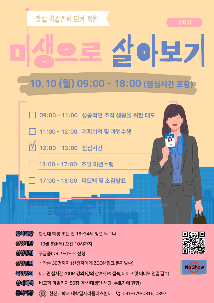 '미생으로 살아보기' 특강은 조직 생활에 대한 추상적인 개념을 실제 상황을 통해 이해하고, 상황에 대처하는 능력을 기르기 위해 준비되었습니다. 관심 있는 학생들의 많은 신청을 바랍니다. * 예정일정은 4차-10/28, 5차-11/6 진행 예정이며, 각 회차별 모집 일정은 추후 공지됩니다. 특강일정은 상황에 따라 변동 가능합니다. 1. 참여대상: 한신대 학생 또는 만 18\~34세 지역청년 누구나 2. 신청기간 : 2022.10.6(목) 오전 10:00까지 3. 신청인원: 선착순 30명까지 (신청자에게 ZOOM 링크 문자발송) 4. 특강방식: 비대면 실시간 ZOOM 강의(강의 참여 시 PC접속, 마이크 및 비디오 연결 필수)