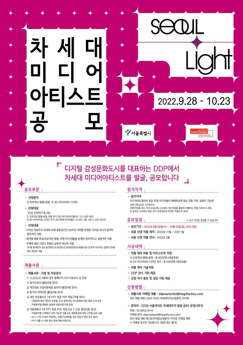 [주제] 동대문의 장소성(한양도성-훈련도감-동대문운동장-풍물시장-DDP로 이어지는 일련의 변화)에서 착안한 작품 [선정대상] ‘23년 선정작가 총 5팀 ① 프로젝션 맵핑+음향 작품 작가 2팀 (미디어아트갤러리, 12\~15분 내외) ② 3D 미디어아트·디자인 작가 3팀 (투명 미디어월(T-OLED), 3분 기준 2\~3개 시리즈) [기간] 공모일: 9월 28 \~ 10월 23일 최종 선정 작품 제작: 2022년 11월 \~ 23년 1월 최종 선정 작품 전시: 2023년 2월\~ (DDP 디자인랩 1층 미디어아트갤러리, 투명미디어월) [참가방법] DDP 홈페이지에서 공모 신청서 및 작품계획서 등 제출서류 다운로드, 작성 후 이메일 제출 [홈페이지] https://ddp.or.kr/index.html?menuno=245 [지원내역] -작품 제작 비용 및 아티스트피 지원 ① 프로젝션 맵핑+음향 : 총 800만원 (세금포함) ② 3D 미디어아트·디자인 작가 : 총 500만원 (세금포함) -작품 제작 기술지원 -DDP 서울라이트 미디어아트 상설전시 공간에서 전시 기회 제공 -서울라이트 메인 작가풀 등록 [주최] 서울디자인재단
