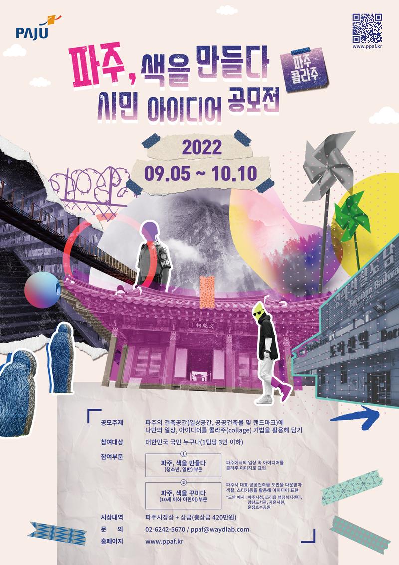 ○ 공모개요 - 파주 콜라주 시민 아이디어 공모전이 진행되니 많은 지원과 관심바랍니다. ○ 공모주제 - 파주에서의 일상을 담을 수 있는 건축공간 : 일상공간, 공공건축물 및 랜드마크 등 - 일상공간 : 매일 보고 거니는 집(학교/회사)앞, 골목, 버스정류장, 공원과 상점가 등 일상에서 경험한, 나만 알고 있는 도시의 공간과 요소들 공유하기 - 공공건축물 및 랜드마크 등 · 파주에서 운영되고 있는 공공건축물 · 다양한 문화공간들과 하천/산 등 파주의 자연환경 · 광장과 가로등을 대상으로 새로운 공간조성 · 설치 참여형 프로그램 · 도시 이벤트 등 파주의 품격과 매력을 더할 수 있는 감성 아이디어 제안하기