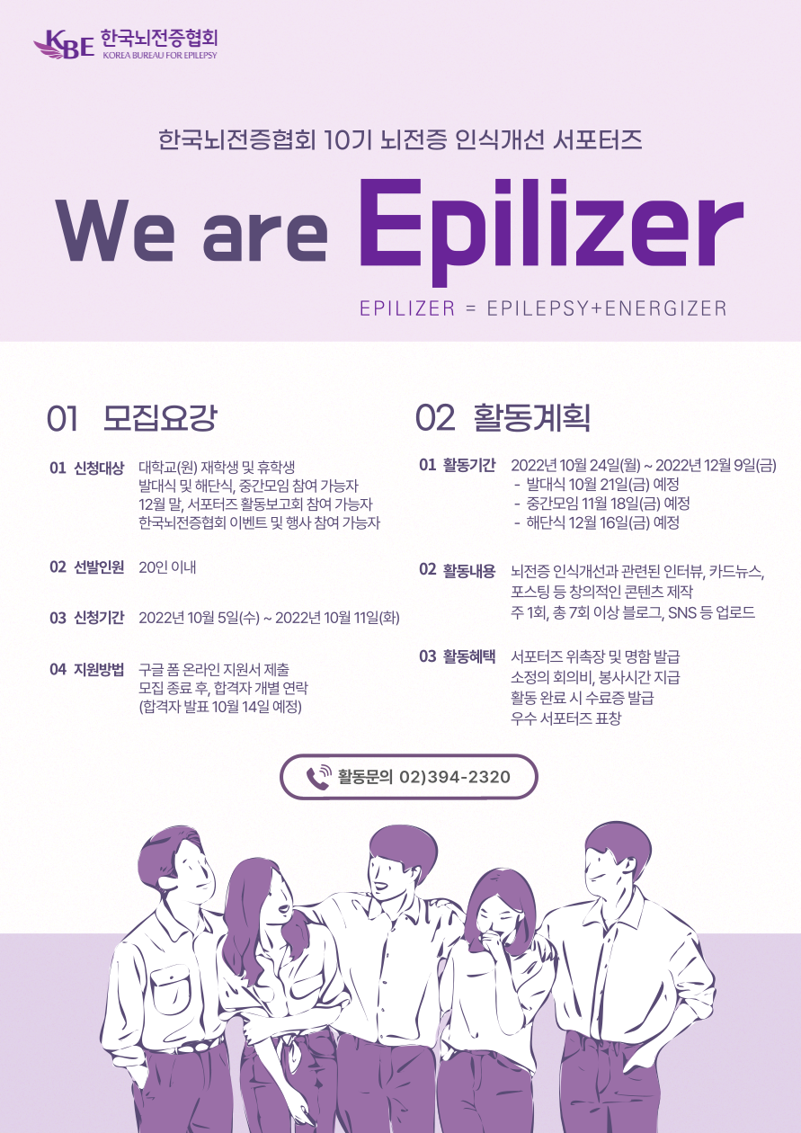 한국뇌전증협회에서 뇌전증에 대해 함께 알아가며, 부정적인 사회 인식을 개선해나갈 제10기 서포터즈 “We are Epilizer”를 다음과 같이 모집하오니 많은 참여 바랍니다.