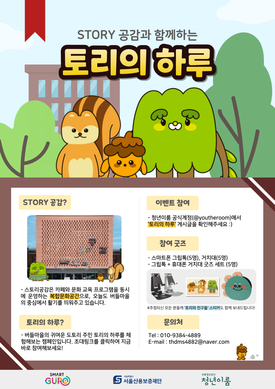 ▶ 주최사 / 활동명 청년이룸 & 서울신용보증재단 / 토리의 하루 ▶ 서비스 소개 “토리의 하루”는 버들마을에 사는 귀여운 토리가 되어 하루를 살아보는 프로젝트입니다. 버들마을의 중심에 위치하는 STORY 공감에서의 귀여운 일상 이야기와 매력 있는 캐릭터들을 직접 만나보세요! ▶ 토리의 하루 URL : https://bit.ly/story-gonggam08