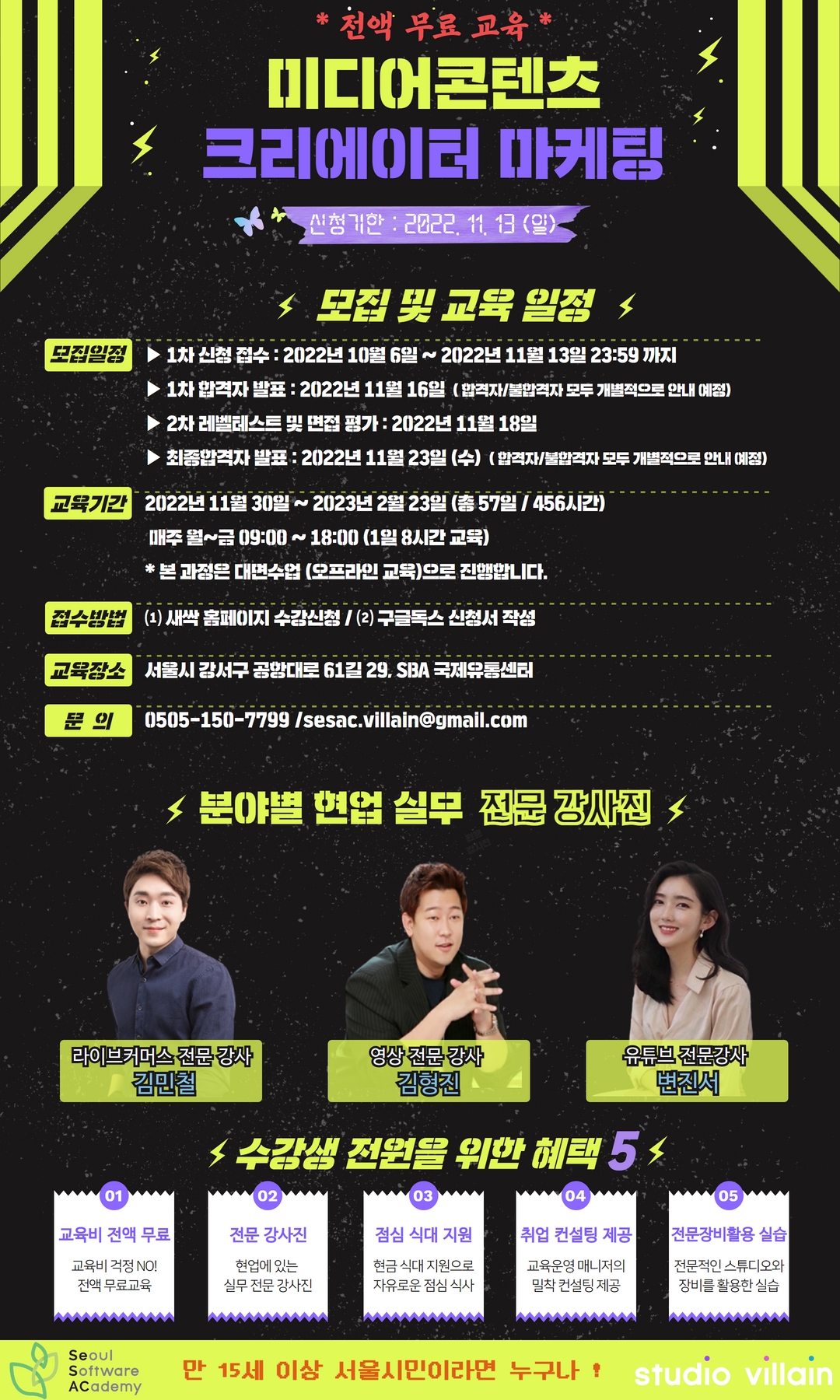■ 해택 ●교육해택 ≫ 교육비 전액무료 ≫ 점심 식비 지원 ≫ 취업을 위한 교육 운영 담당 매니저의 취업 컨설팅 진행 ≫ 현업에 있는 전문 강사진을 통한 꿀팁 전수! ≫ 콘텐츠 마케터가 되기 위한 기업 매칭데이 진행 ≫ 전문적인 스튜디오/장비를 활용한 실제 방송체험 제공