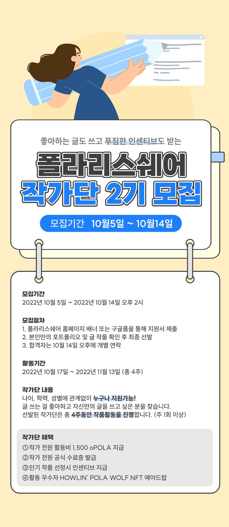 🎁작가단 2기를 위한 특별 혜택🎁 ▫️ 1,500 oPOLA 가상화폐 활동비 지급 ▫️ 인기글 채택시 작가 인센티브 보상까지! ▫️ 공식 작가단 수료증 ▫️ 우수 참여작가 HOWLIN’ POLA WOLF NFT 지급 (큐레이터 자격 부여)
