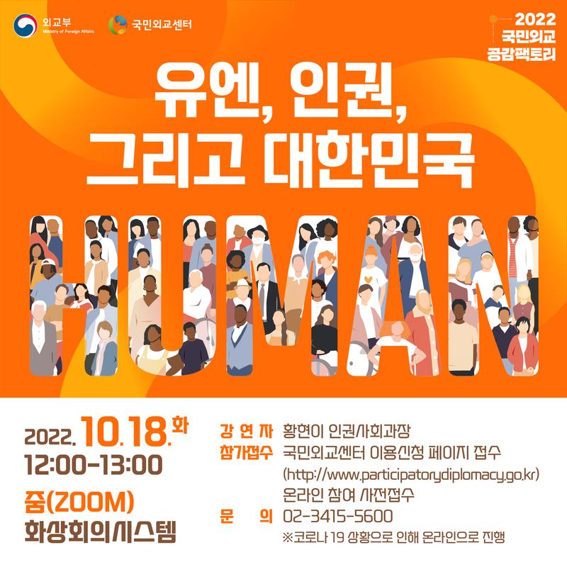외교부는 10월 18일(화) 12:00-13:00 “유엔, 인권, 그리고 대한민국" 을 주제로 국민외교 공감팩토리를 개최할 예정입니다. 이번 행사는 코로나19 상황으로 인해 온라인으로 진행될 예정입니다. 국민 여러분의 많은 관심과 참여를 부탁드립니다.
