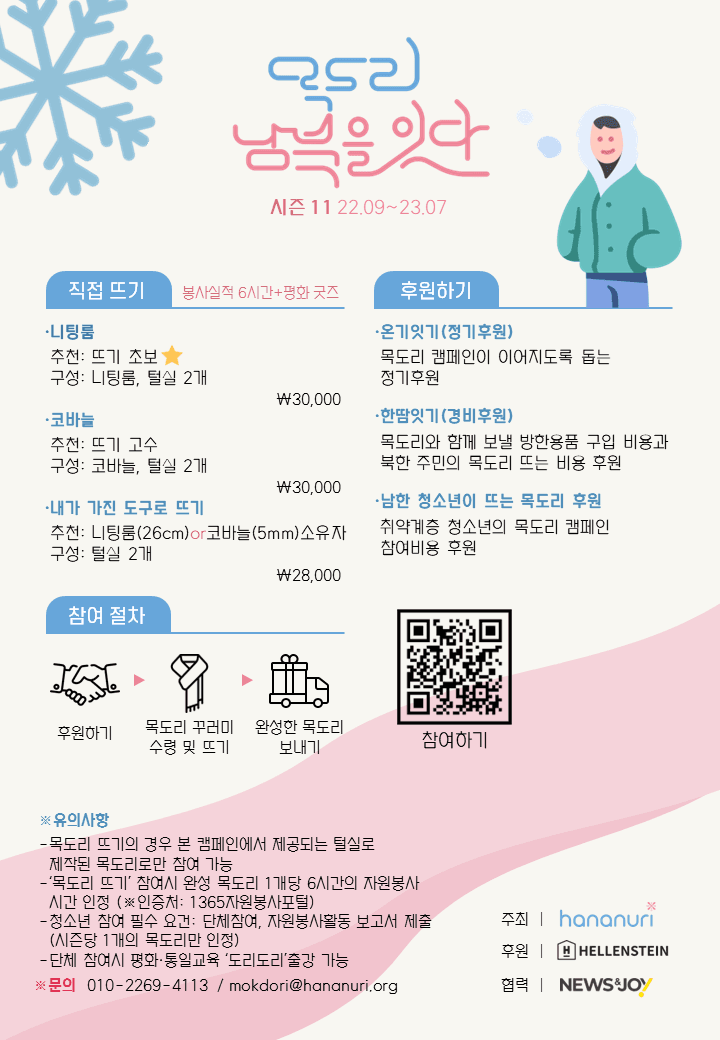 ▶주최사 / 활동명 사단법인 하나누리 / 목도리 남북을 잇다 시즌11 ▶활동내용 🧣북한 및 한민족 디아스포라 어린이를 위한 목도리 뜨기 ▶모집 및 활동기간 📑2022. 09 \~ 2023. 07 (11개월) ▶활동 지역 🇰🇷 전국 ▶활동 혜택 📌목도리 1개당 6시간의 자원봉사활동 실적 등록 ※ 등록처 : 1365자원봉사포털 ▶상세공고 및 신청하기 👉 하나누리 목도리 캠페인 페이지에서 후원 신청 http://www.hananuri.org/scarf