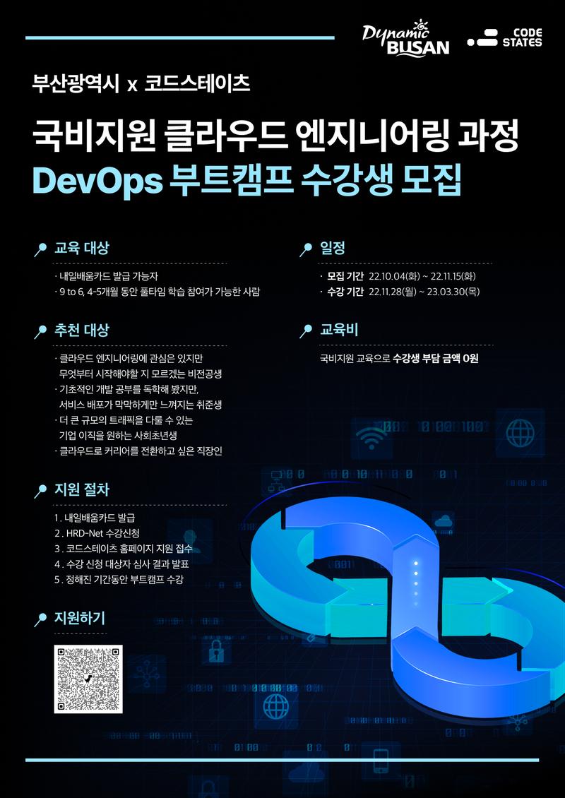 DevOps 부트캠프는 ‘개발(development)’과 ‘운영(operation)’의 합성어이자, 클라우드 서비스를 빠르고 안정적으로 제공할 수 있도록 조직의 역량을 향상시키는 방법론인 ‘데브옵스(DevOps)’ 직군의 전문성을 배양할 수 있도록 설계된 IT 교육 코스입니다.