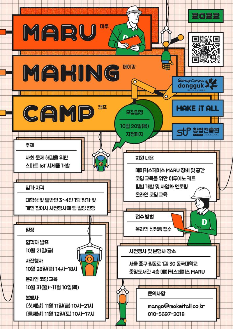 사회문제 해결을 위한 스마트 IoT 시제품 개발을 위한 2022 MARU making camp에 참가할 참여자를 모집합니다.