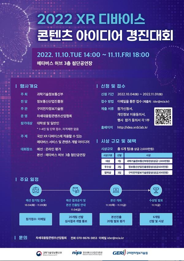 ※시상내역은 변경될 수 있음 ●응모 일정 -‘22. 10. 04.(화) \~ 11.01.(화) 오후 18:00까지 ●제출 방법 -공모전 홈페이지(idea.xrdclab.kr)에서 양식 다운로드 후 접수 *서명란에 반드시 자필로 서명하여 제출 ●운영방안 ○ 심사기준 : 제안동기 및 핵심기술, 구체성 및 우수성, 창의성 및 차별성, 시장성 등 종합 평가 ○ 심사방법 : 예선 평가(서류 평가) → 멘토링 → 본선 평가(발표 평가) - 예선평가 : 지원서 내용을 서면 평가하여 본선 진출 20팀 선발 - 멘토링 : 본선 진출팀 대상 국산 XR 디바이스를 제공하여 적용 방법에 대한 전문가 멘토링*을 통해 아이디어 고도화 * 국산 XR 디바이스(6종, 붙임 1 참고)를 제공하여 전문가 멘토링(GERI, XR 디바이스 기업 등) 과정을 통해 디바이스에 적용 가능하도록 콘텐츠 보완 및 고도화 - 본선평가 : 최종 결과물 발표평가를 통한 최종 수상팀 선정 ○ 본선일정 : ’22. 11. 10(목) \~ 11. 11(금) ※ 상황에 따라 심사방법과 일정 등이 변경될 수 있음 ●참가제한 ➀ 동일 아이템으로 전년도 진흥원 및 타 기관 공모 대회 입상자(팀) ➁ 동일 아이템으로 정부 및 지자체, 타 기관으로부터 보조금(지원금)을 지원받아 개발 중이거나 개발 완료한 사업(과제)을 중복 신청하는 경우 ➂ 타인의 특허ㆍ실용신안 등 지적재산권을 침해할 우려가 있는 아이디어 ➃ 공고일 기준 국가연구개발(또는 지원) 사업에 참여 제한 조치 중인 기업(대표) 및 사업 책임자 ●문의 사항 - 2022 XR 디바이스 콘텐츠 아이디어 운영사무국 전화 : 070-8676-3853 이메일 : idxr@ncia.kr