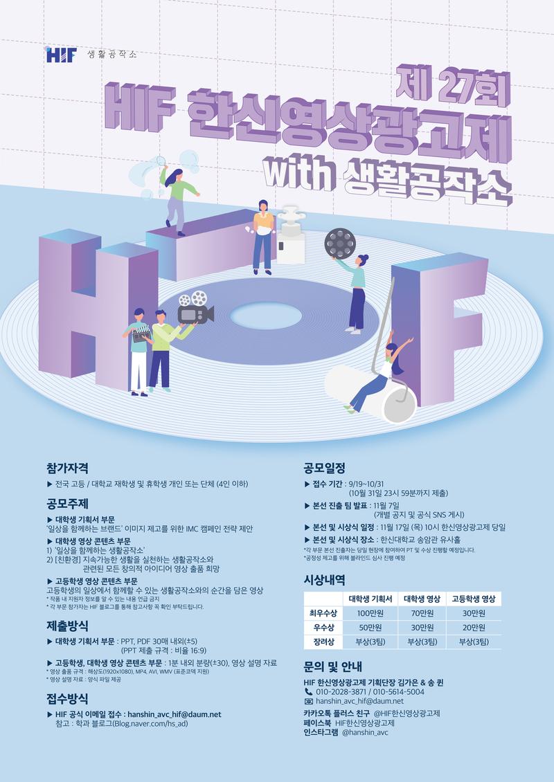 ○ 공모개요 - 제27회 HIF 한신영상광고제 with 생활공작소가 진행되니 많은 지원과 관심바랍니다.