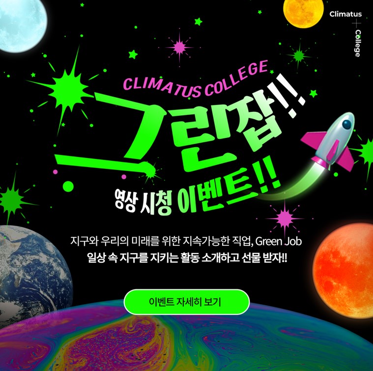 🎁이벤트 기간 : 2022.10.1(토) \~23(일) 🎁이벤트 경품 : 별다방 기프티콘(77명) 🎁당첨자 발표 : 2022. 11.1(화) *유튜브 고정 댓글 🎁 참여방법 1) '클리마투스 컬리지' 유튜브 채널 구독과 좋아요!! 2) "그린잡 소개 영상" 시청하기 3) "생활 속 실천하고 계신 지구를 지키는 활동" 댓글로 소개하기 4) 댓글 캡쳐하여 '이벤트 접수' 링크로 제출!! ✅ 이벤트 접수 👉 https://climatuscollege.org/Green_Job 주최 : 재단법인 기후변화센터 후원 : 한국기후·환경네트워크 ---------------------------------------------------------- ➫ 클리마투스 컬리지: https://climatuscollege.org ➫ 인스타그램: https://www.instagram.com/climatuscollege ➫ 기후영웅이 되어주세요: https://bit.ly/2Zhbe8n ----------------------------------------------------------