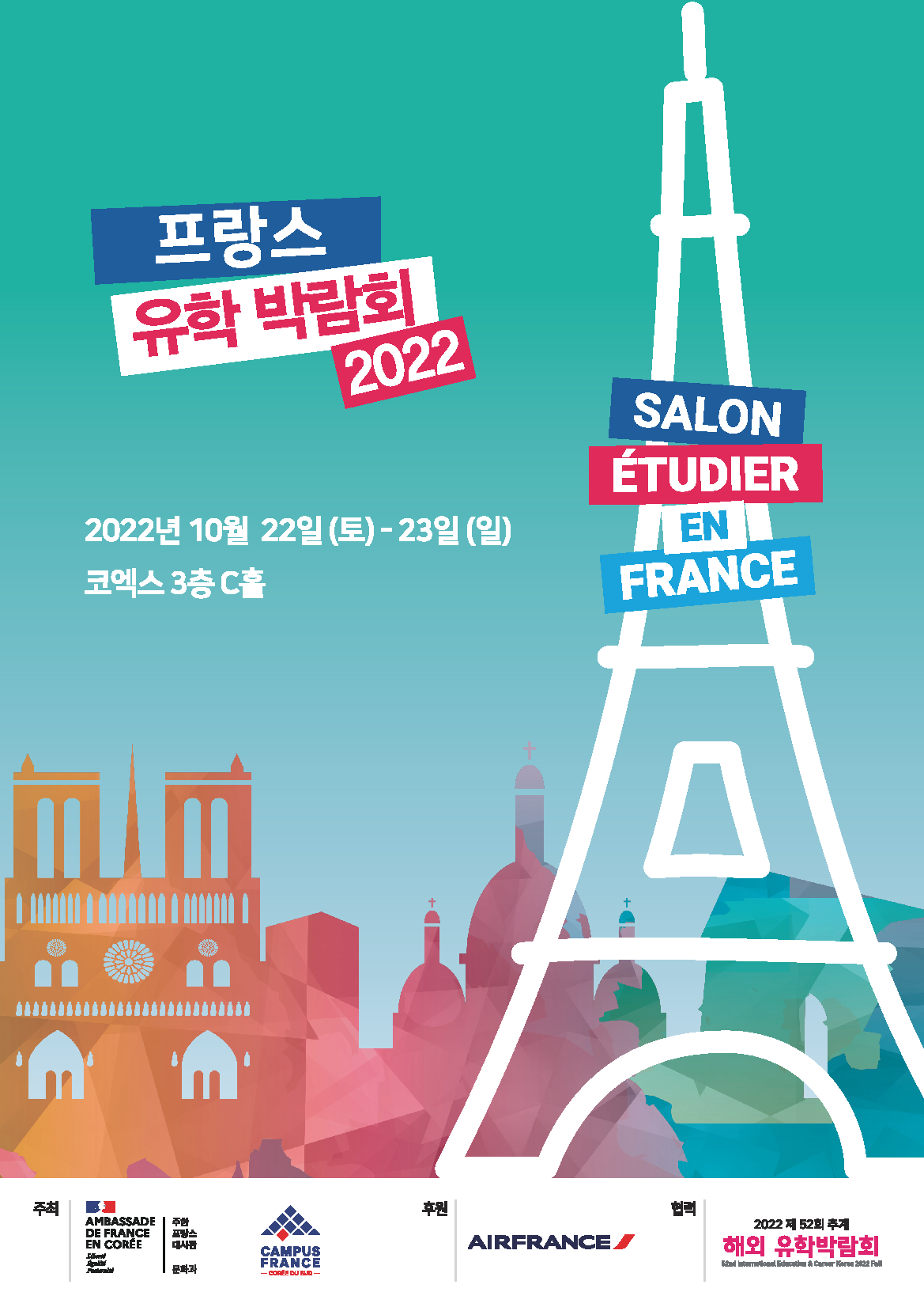● 모집개요 오는 10월 22, 23일 양일간 코엑스에서 개최되는 제 52회 해외 유학 박람회 내에서 주한 프랑스 대사관 주최로 다양한 분야의 교육 기관(프랑스 국립대학, 상경계·이공계·정치학 그랑제꼴, 향수, 패션, 요리 및 호텔 경영 등 전문학교)이 참여하는 « 2022 프랑스 유학 박람회 »가 개최될 예정입니다. 이번 행사는 특별히 프랑스가 주빈국으로 초청되어 진행됩니다.