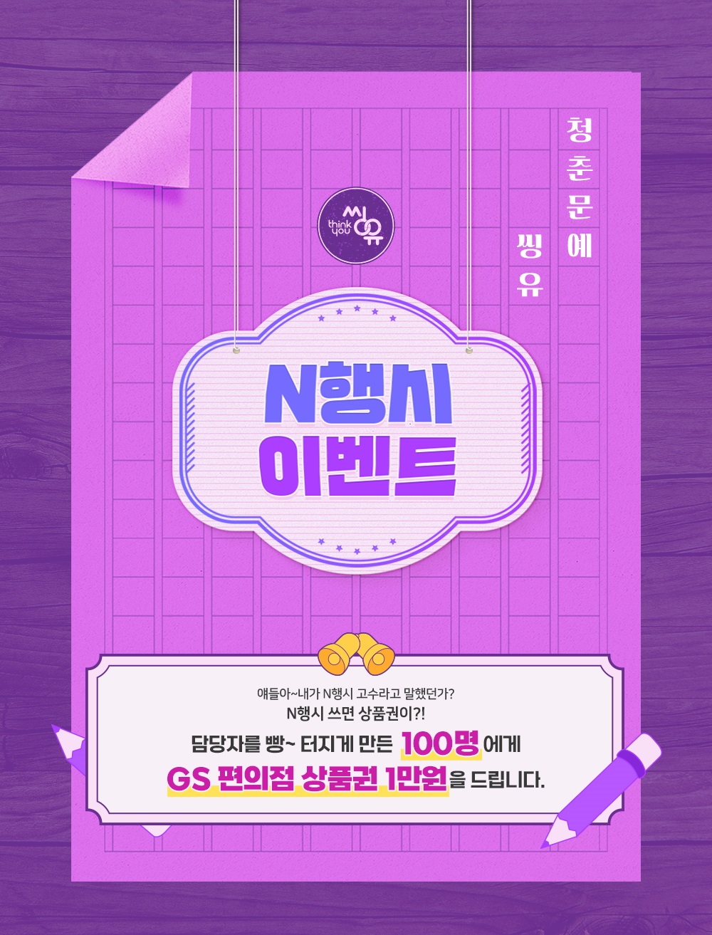 ● 응모 개요 - 씽유 청춘문예 "N행시 이벤트" 얘들아\~ 내가 N행시 고수라고 말했던가? N행시 쓰면 상품권이?! 담당자를 빵\~ 터지게 만든 100명에게 GS편의점 상품권 1만원 기프티콘을 드립니다!