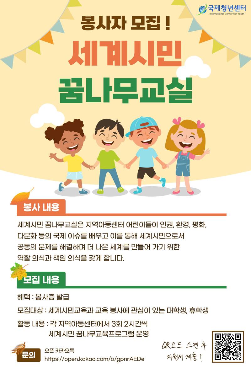 <국제청년센터 세계시민꿈나무교실 봉사자 모집> “세계시민꿈나무교실”은 지역아동센터 어린이들에게 빈곤, 인권, 환경, 평화 등의 어려운 국제 이슈들을 재밌는 놀이와 함께 진행하여 쉽게 이해할 수 있도록 대학생 멘토들이 운영하는 세계시민교육 프로그램입니다. [모집내용] * 모집기간: 10월 19일(수)까지 * 모집대상: 세계시민교육과 교육봉사에 관심 있는 국내 대학생 * 모집인원: 5명 * 활동기간: 11월 6일(수), 23일(수), 30일(수) 오후 3시 30분\~ 5시 30분(2시간씩 3회) * 활동혜택: 봉사증 및 우수팀 시상 * 서류합격자 발표: 각 지역 개별 연락하여 안내 드립니다. * 면접일정: 각 지역 개별 연락하여 안내 드립니다. * 오리엔테이션: 10월 22일(토) 오리엔테이션 일정과 장소에 대한 안내는 최종 합격자에게 개별적으로 연락드립니다. * 자세한 내용은 https://cafe.naver.com/uneedsbus/1385 를 참조해주세요.