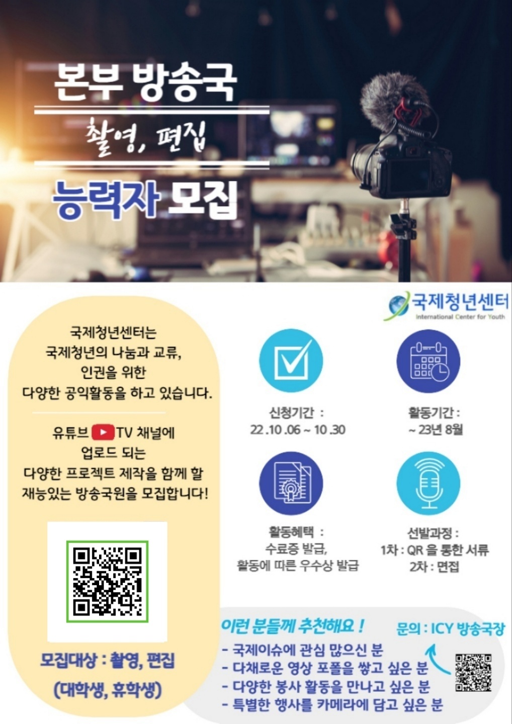 [국제청년센터 3기 방송국원 모집] 국제청년센터는 국제청년의 나눔과, 교류 그리고 인권을 위한 국제NGO로 국내외 7개 지부를 두고 있으며 'Love the Difference.'을 슬로건으로 청년들이 다양한 공익 활동을 펼치고 있습니다. 국제청년센터 본부 방송국에서 유튜브 TV 에 업로드 될 프로젝트를 진행 할 촬영, 편집에 재능있는 청년을 모집합니다! 1. 신청 분야 촬영, 편집, 취재 기자 2. 신청 자격 대학생 및 휴학생으로 지원 분야에 경험이 있으며 책임감 있게 같이 프로젝트 진행하실 분 3. 활동기간 2023년 8월말까지 4. 신청 방법 10월 30일까지 QR코드 스캔 또는 신청서 링크를 통해 온라인 신청서 제출 * 신청 링크 : https://forms.gle/CEBbZnY3j4MxqXbc9 * 제출한 신청서로 1차 합격자 선발, 면접으로 최종 선발합니다. 1차 합격자는 개별 통보 드립니다. 5. 혜택 수료증 발급, 우수 활동가 시상 6. 문의 : 1:1 오픈채팅방 https://open.kakao.com/o/sJojZpZd