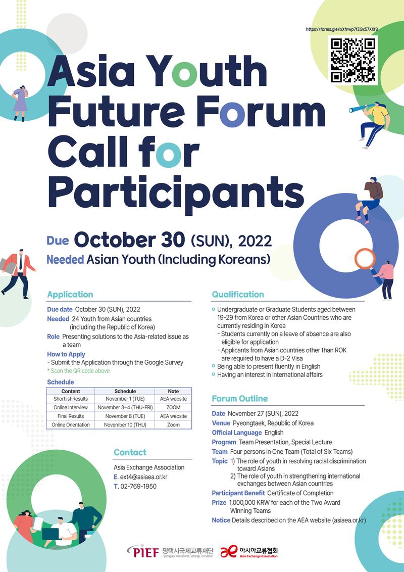 아시아교류협회가 평택시국제교류재단과 함께 「아시아 청년 미래 포럼(Asia Youth Future Forum)」을 11월 27일(일)에 개최합니다. 국제적 이슈에 대한 해결책을 모색하고 제시 및 발표하면서 글로벌 리더로 성장하여 아시아의 밝은 미래를 이끌어 나아갈 청년 참가자를 모집하고 있으니 많은 관심과 지원 부탁드립니다. 서류 접수 마감일은 10월 30일이며, 자세한 내용은 아시아교류협회 홈페이지(asiaea.or.kr)에서 확인해 주시기 바랍니다. 지원링크: [https://forms.gle/bXfnwp7fZQx57XXf8]