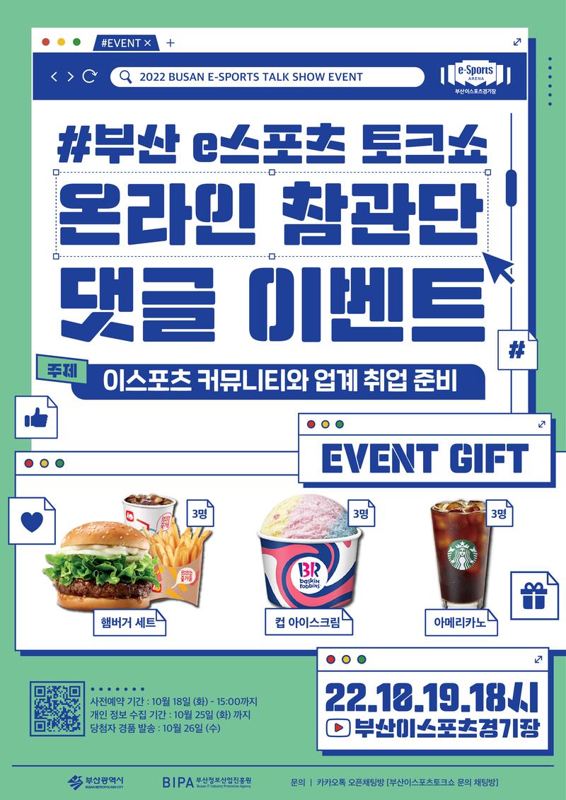 📍 온라인 참관단 댓글 이벤트 - 2022 부산 이스포츠 토크쇼 유튜브 스트리밍 진행 중 토크쇼에 대한 시청 소감이나 하고 싶은 말을 댓글로 작성하면 추첨을 통하여 푸짐한 경품이 팡팡!
