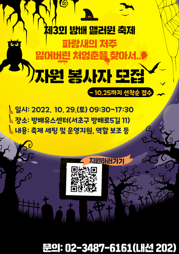 코로나19 이후 3년만에 진행하는 방배 핼러윈 축제 운영에 많은 도움을 주실 대학생 및 성인 자원 봉사자를 모집하고 있습니다. 색다른 봉사활동을 경험하고 싶다면! 핼러윈 축제를 체험하고 싶다면!! 주저말고 지원하세요 :) ○ 일 시 : 2022. 10. 29.(토) 09:30\~17:30 (OT 당일 진행) ○ 장 소 : 서초구립방배유스센터(서초구 방배로5길 11) ○ 내 용 : 제3회 방배 핼러윈 축제 업무지원 및 부스운영 ○ 신청링크: https://forms.gle/TQvEHak4c1VWrNN89 ○ 세부내용 - 참가자 안내/관리, 행사 안내, 부스 세팅 및 운영지원, 물품관리, 마무리 정리 등 ○ 인 원 : 00명(20세 이상 29세 이하 대학생 및 성인) ○ 혜 택 : 봉사시간 8시간 지급, 점심식사 제공 (당일) ○ 문 의 : 02-3487-6161(내선 202) 방배유스센터 청소년사업팀 홍정모