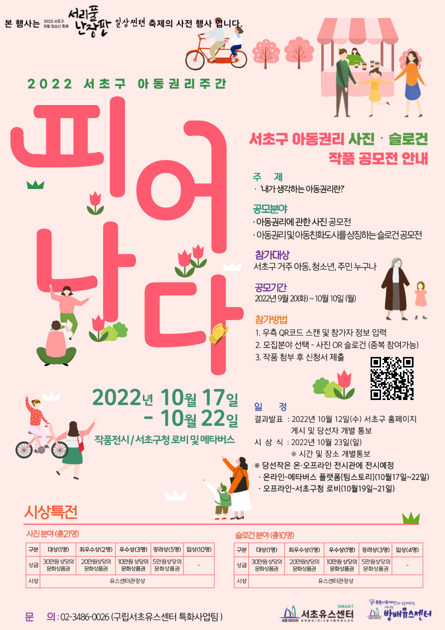 🌸2022년 서초구 아동권리주간 '피어나다'🌸 서초구 아동권리 사진•슬로건 작품 공모전🏆 📌공모기간 2022년 9월 20(화)\~10월 10일(월) 📌참가대상 서초구 거주 아동, 청소년 주민 누구나 📌공모분야 •아동권리에 관한 사진 공모전 •아동권리 및 아동친화도시를 상징하는 슬로건 공모전 📌주제 '내가 생각하는 아동권리란?' 📌참가방법 1. 포스터에 첨부된 QR코드 스캔 및 구글폼(https://forms.gle/TWZbBffbF5yErkqj9)을 통한 참가자 정보입력 2. 모집분야 선택-사진 OR 슬로건(중복 참여가능) 3. 작품 첨부 후 신청서 제출 📌일정 결과발표 : 2022년 10월 12일(수) 서초구 홈페이지 게시 및 당선자 개별통보 시상식 : 2022년 10월 23일(일) 📢시간 및 장소 개별통보 📢당선작은 온•오프라인 전시관에 전시예정 •온라인-메타버스 플랫폼 [팀스토리] (10월17일\~22일) •오프라인-서초구청 로비(10월19일\~21일) 📌시상내역 1.사진 분야(총21명) 2.슬로건 분야(총10명) 📢자세한 상금 및 시상에 대한 내용은 포스터 참고 📌문의사항 02-3486-0026(서초유스센터 특화사업팀 최지윤)