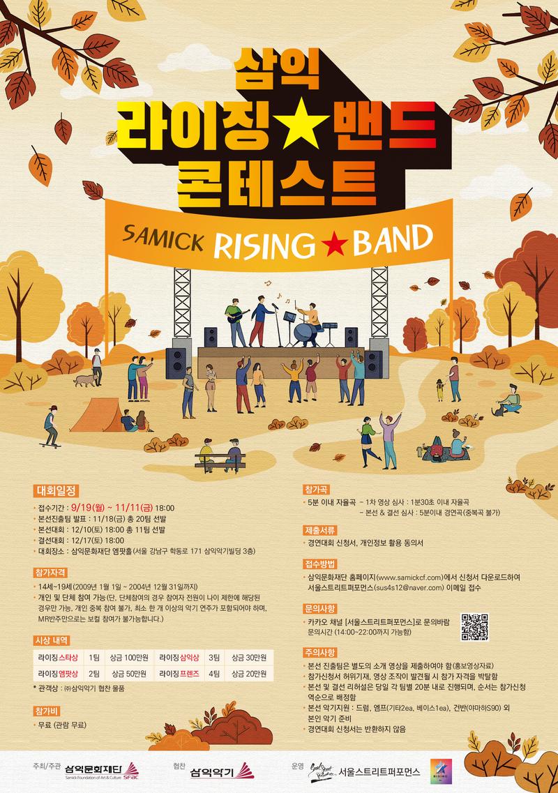 🎶삼익 라이징★밴드 콘테스트🎶 1. 대회일정 - 접수기간 : 9/19(월) \~ 11/11(금) 18:00 - 본선진출팀 발표 : 11/18 (금) 총 20팀 선발 - 본선대회 : 12/10(토) 18:00 총 8팀 선발 - 결선대회 : 12/17(토) 18:00 - 본선장소 : 삼익문화재단 엠팟홀 (서울 강남구 학동로 171 삼익악기빌딩 3층) 2. 시상 내역 - 라이징스타상 : 1팀 상금 100만원 및 엠팟홀 단독공연 - 라이징엠팟상 : 2팀 상금 50만원 - 라이징삼익상 : 3팀 상금 30만원 - 라이징프렌즈 : 5팀 상금 20만원 및 엠팟홀 합동 기획공연 * 관객상 : ㈜삼익악기 협찬 물품 3. 참가자격 - 14세\~19세(2009년 1월 1일 \~ 2004년 12월 31일까지)\, 개인 및 단체 참여 가능(단\, 단체참여의 경우 참여자 전원이 나이 제한에 해당된 경우만 가능\, 개인 중복참여 불가\, 최소 한 개 이상의 악기 연주가 포함되어야 하며\, MR반주만으로는 보컬 참여가 불가능합니다.) 4. 참가비 - 무료 (관람 무료) 5. 참가곡 -1차 영상 심사: 1분30초 이내 자율곡 -본선 & 결선 심사: 5분이내 경연곡 6. 제출서류 - 경연대회 신청서\, 개인정보 활용 동의서.영상촬영물 동의서 (네이버 폼 참고) 7. 접수방법 ①아래 링크의 참가신청서(네이버 폼) 작성 →참가신청서(네이버 폼)https://naver.me/GGUjqkYz ②최대 1분 30초 내외로 개인곡/밴드곡 촬영하여 유튜브 업로드 ③카카오 채널 [서울스트리트퍼포먼스]에 "이름(팀명)_참가곡"과 영상 유튜브 링크 보내기 8. 문의사항 -카카오 채널 [서울스트리트퍼포먼스]로 문의 문의시간 (14:00\~22:00까지 가능함) - E-mail: sus4s@naver.com 9. 주의사항 - 본선 진출팀은 별도의 소개영상을 제출하여야 함 (홍보영상자료) - 참가신청서 허위기재\, 영상 조작이 발견될 시 참가 자격을 박탈함 - 본선 및 결선 리허설은 당일 각 팀별 20분 내로 진행되며\, 순서는 참가신청 역순으로 배정함 - 본선 악기지원 : 드럼\, 엠프(기타2ea\, 베이스1ea)\, 건반(야마하S90) 외 본인 악기 준비 - 경연대회 신청서는 반환하지 않음 - 전화문의는 가급적 삼가드립니다. 전화를 받을 수 없는 상황이 많습니다. 주최/주관: 삼익문화재단 협찬: 삼익악기 운영: 서울스트리트퍼포먼스