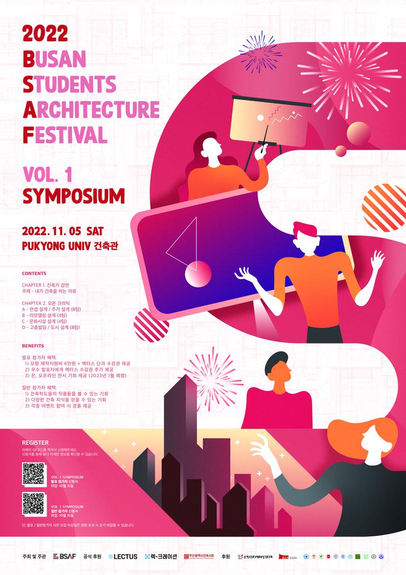 🎉 부산 학생 건축 페스티벌 VOL.1 심포지엄 [BUSAN ARCHITECTURE STUDENTS FESTIVAL] 📝 VOL.1 SYMPOSIUM . 안녕하세요 부산학생건축페스티벌 BSAF 입니다. 부산 건축학도 축제의 장인 2022년 제 2회 부산 건축 페스티벌 “심포지엄 “을 소개합니다 ✨ . 건축이라는 열정 아래 두 단체가 한 자리에 모여 학생들을 위한 뜻 깊은 행사를 진행하게 되었습니다. 각 단체의 장점을 녹인 두가지의 행사를 진행하며 첫번째로 진행하게 되는 행사는 교류전인 심포지엄 입니다. . 이번 심포지엄은 학생 간 활발한 교류와 소통의 장을 마련하기 위한 행사입니다. 부산 지역 건축학도 학생들이 진행중인 설계 프로젝트를 서로 공유하며 아이디어를 주고 받음과 동시에 다양한 지식을 얻을 수 있는 기회가 될 것입니다. . 심포지엄에 참여하시는 학우분들을 위해 다양한 혜택 및 상품 등을 준비했습니다. . 자세한 사항은 아래 링크트리를 통해 신청 및 문의 가능하며 각 단체 인스타를 통해 확인 가능하니 링크트리 참조 부탁드립니다. . 부산학생건축페스티벌 (BSAF)바로가기: https://linktr.ee/bsaf_official ▪️일정 : 2022년 11월 05일 ▪️신청 기간 : 09월 21일 \~ 10월 31일 18:00 ▪️장소 : 부경대학교 건설관 C22 ▪️참가비 : 발표 참가자 무료, 일반 참가자 5,000원 ▪️주최 , 주관 부산건축 학생연합동아리 BAUU & 부산경남학생 건축디자인연합 GAON ▪️공식 후원 LECTUS, 렉-크레이션, 부산광역시건축사회 ▪️후원 한국건축가협회 부산건축가회, 부산건축제 부경대학교, 경성대학교, 동명대학교, 동서대학교, 동아대학교, 동의대학교, 부산대학교, 신라대학교, 울산대학교, 인제대학교, 한국해양대학교