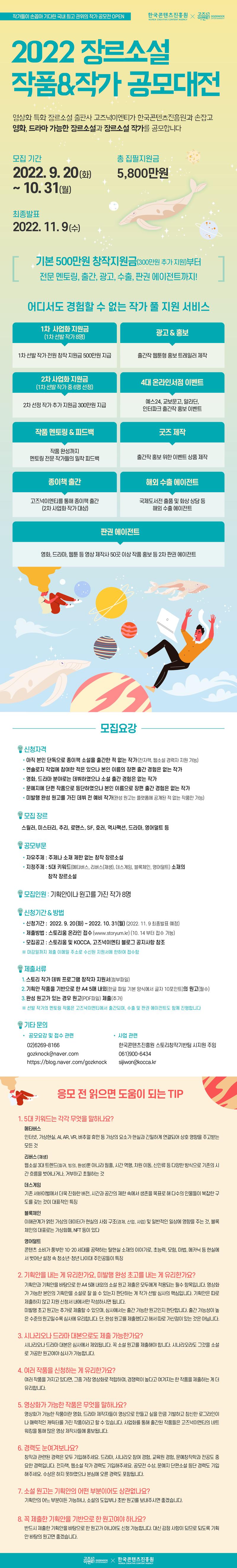 ○ 신청자격 • 아직 본인 단독으로 종이책 소설을 출간한 적 없는 작가(전자책, 웹소설 경력자 지원 가능) • 엔솔로지 작업에 참여한 적은 있으나 본인 이름의 장편 출간 경험은 없는 작가 • 영화, 드라마 분야로 데뷔하였으나 소설 출간 경험은 없는 작가 • 문예지나 신춘문예에 단편 작품으로 등단하였으나 본인 이름으로 장편 출간 경험은 없는 작가 • 미발행 완성 원고를 가진 데뷔 전 예비 작가(완성 원고는 플랫폼에 공개된 적 없는 작품만 가능) ○ 모집장르 스릴러, 미스터리, 추리, 로맨스, SF, 호러, 역사팩션, 드라마, 영어덜트 등 ○ 공모부문 (작품 소재)** • 자유주제 : 주제나 소재 제한 없는 창작 장르소설 • 지정주제 : 5대 키워드(메타버스, 리버스-재생, 데스게임, 블록체인, 영어덜트) 소재의 창작 장르소설 ○ 모집인원 기획안이나 원고를 가진 작가 8명 ○ 신청기간 & 방법 ㅇ 신청기간 : 2022. 9. 20.(화) \~ 2022. 10. 31(월) (2022. 11. 9 최종발표 예정) ㅇ 제출방법 : 스토리움(www.storyum.kr) 온라인 접수 (10. 14 부터 접수/제출 가능합니다) - 통합공고문 내 고즈넉이엔티 참가신청서 다운로드 후 작성 - 참가신청서 및 제출서류를 하나의 파일로 압축하여 제출 ※ 파일명 : 성명_고즈넉이엔티.zip ○ 제출서류 1. (필수)스토리 작가 데뷔 프로그램 창작자 지원서(첨부파일) 2. (필수)기획안 기반으로 한 A4 5매 내외 원고(습작물) (규격 : 한글 파일 기본 양식에서 글자 10포인트로 작성) 3. (선택)완성 원고가 있는 경우 원고(PDF파일) 제출 ※선발 작가의 멘토링 작품은 고즈넉이엔티에서 출간되며, 수출 및 판권 에이전트도 함께 진행합니다 ○ 기타 문의 ㅇ 공모요강 및 접수 관련 : 고즈넉이엔티 지원사업팀 - ☎ 02)6269-8166 - E-mail : gozknock@naver.com - 공모 안내 : https://blog.naver.com/gozknock - 출판사 대표 홈페이지 : http://www.gozknock.com/ ㅇ 사업개요 관련 : 한국콘텐츠진흥원 만화스토리산업팀 시지원 주임 - ☎ 061)900-6434 / E-mail: sijiwon@kocca.kr ㅇ 시스템 접수 관련 문의 : 스토리움(☎ 1800-9065 / E-mail admin@storyum.kr)