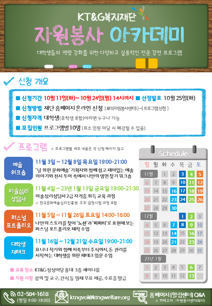 ▶ 지원사항 : 대학생 역량 강화를 위한 전문 교육 프로그램 - 나만의 명언 찾기\, 예술 워크숍 : 11/3\~12/8 매주 목요일 19:00\~21:00 (6회기) - 미술심리상담사 2급 취득 과정 : 11/4\~1/13 매주 금요일 19:00\~21:30 (10회기) - 노션과 피피티 활용\, 퍼스널 포트폴리오 : 11/5\~11/26 매주 토요일 14:00\~16:00 (4회기) - 돈 관리 첫걸음\, 대학생 재테크 : 11/16\~12/21 매주 화요일 19:00\~21:00 (6회기) ★ 교구 및 강의, 간식 등 일체 무료 제공, 교육 종료 후 수료증 발급 ★ ※ 기타 자세한 내용은 홈페이지 공지사항을 참고해 주시기 바랍니다.
