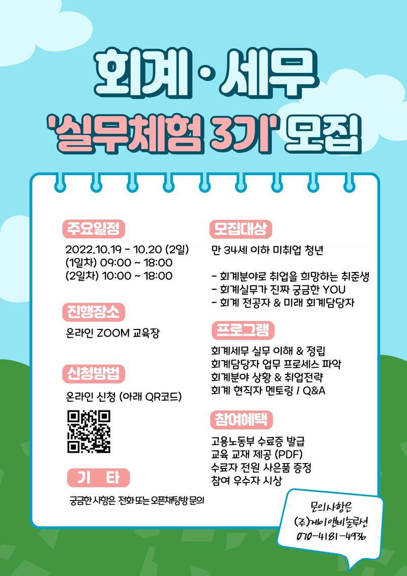 ⭐️[회계세무 실무체험 프로그램 3기 모집]⭐️ 💁 누가 들으면 좋을까요? ∨ 회계실무에 대해 알고 싶은 청년 ∨ 회계 관련 전공자 & 취업준비생 ∨ 회계분야 취업을 희망하는 청년 ∨ 회계분야 현직자를 만나고 싶은 청년 ∨ 회계/세무분야 자격증을 취득한 청년 ∨ 회계 관련 학과를 전공한 청년 💁 진행내용 ∨ 1. 회계/세무 이론편(10H) - 회계분야 취업전략 탐색 - 일반회계 및 세무실무 이론 정립 - 회계전문 지식과 Dart 감사보고서 리뷰 - 세무파트 실무수행 프로세스 ∨ 2. 회계 현직마 멘토링& 실습(4H) - 현직자 기업 & 직무소개 - 회계분야 취업준비 노하우 - 10년차 현직자의 실무수행 방법 - 회계실무 기초 실습 & 피드백 ∨3. 청년고용정책 안내(1H) - 청년에게 유용한 고용정책 - 청년에게 필요한 복지정책 👉 회계부서 신입사원이 수행하는 실무 전격 공개 👉 회계 현직자와의 만남을 통해 궁금증 해소 💁 진행일정 ∨ 일시 : 10.19(수)\~10.20(목) / 총 2일, 15시간 ∨ 시간 : 1일차 9\~18시, 2일차 10\~18시 ∨ 장소 : 온라인 ZOOM 교육장 👉 단순 이론적 내용이 아닌 실무에서 활용되는 Real 지식 👉 학교, 타기관 어디에서도 들을 수 없었던 확실한 교육 💁 참여 신청서 : https://naver.me/xtHXRFCt 💁 기타 ∨ 신청 기간 : \~ 10/18(수) 14:00 까지 ※ 모집인원 완료시 조기마감 될 수 있음 ∨ 참여효과 - 고용노동부 수료증 발급 - 교육 교재 제공 (PDF) - 수료자 전원 사은품 증정 - 우수 참여자 시상 및 상품 증정 ※ 선발자 한해 '카카오톡 오픈채팅방' 링크를 문자로 개별 안내 ※ 전액 국비지원 무료혜택, 온라인 비대면 교육 진행 ※ 문의사항은 전화 또는 오픈채팅방으로 주세요 :) ★ 문의 오픈 채팅방 : https://open.kakao.com/o/sqAJxlGe ▷ 제이앤비솔루션 070-4181-4936 / jnbsolution@naver.com