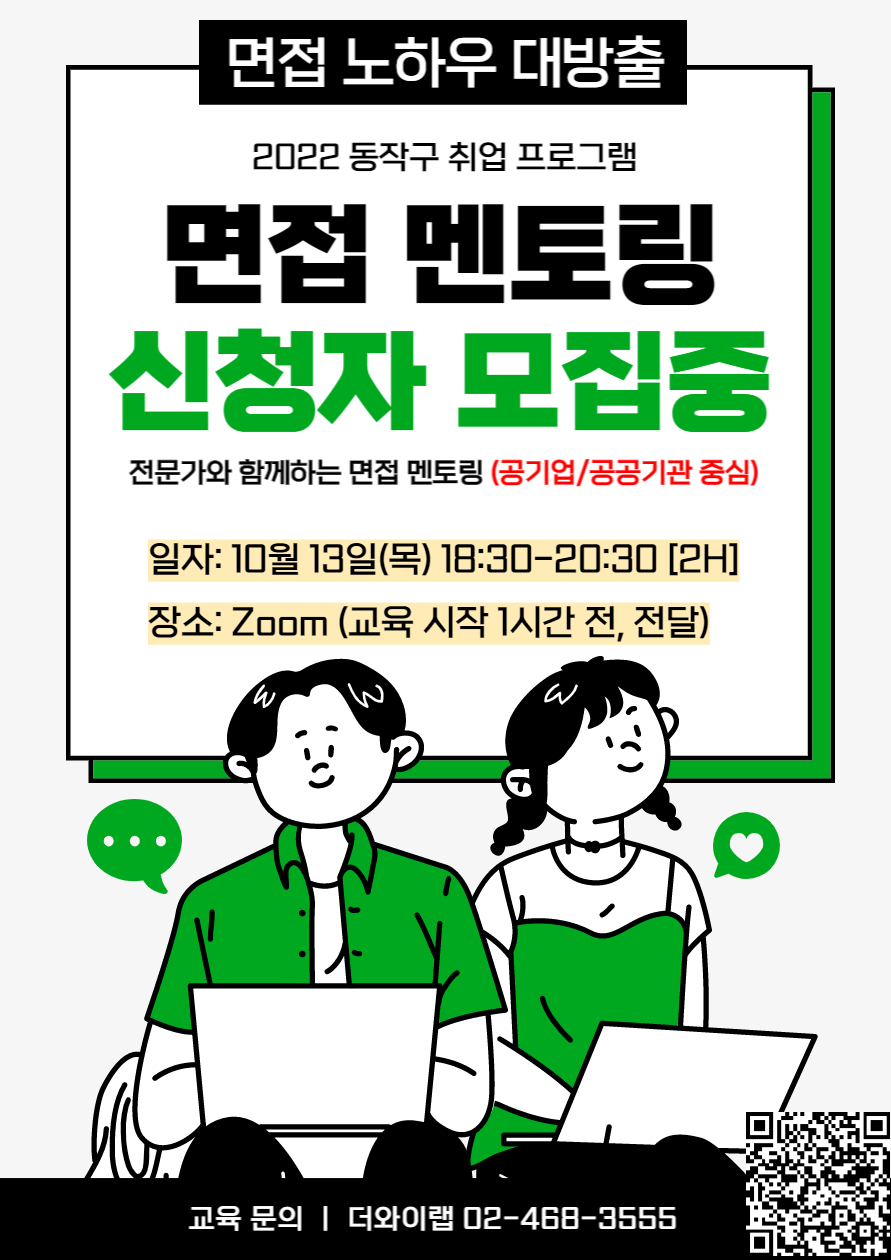 전문가와 함께하는 면접 멘토링(공기업, 공공기관 중심)! 평소 취업 및 면접 준비에 어려움을 가졌던 모두에게 추천합니다! 전문가가 알려주는 현실적인 취업트렌드, 공공기관 기업 분석 그리고 면접 준비 주요 전략이 궁금하시지 않은가요\~? 여러분의 궁금증을 해결하고 싶다면? 망설이지 말고 신청해주세요! 😊