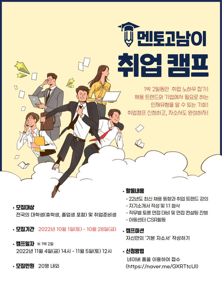 ❍ 대상 – 전국의 대학생(휴학생,졸업생 포함) 및 취업준비생 ❍ 모집기간 – 2022년 10월 01일 \~ 2022년 10월 28일 ❍ 일자 – 2022년 11월 4일 14시 \~ 2022년 11월 5일 11시 (1박2일) ❍ 모집인원 – 20명 내외 ❍ 활동내용 - 22년도 최신 채용 동향과 취업 트랜드 강의 - 자기소개서 작성 및 1:1 첨삭 - 직무별 토론 면접 대비 및 면접 컨설팅 진행 - 지역아동센터 CSR 활동 진행 ❍ 참가비 안내 - 참가비는 숙소 및 식사 예약 완료 후 무단 불참 방지를 위함이며, 전액 기념품 제공(3만원 이상) 및 시상으로 사용됩니다. - 입금계좌 안내: 신한은행 ㈜더블엠 100-035-486989 ❍ 신청방법 - 네이버 폼을 이용하여 접수 (https://naver.me/GXRTtcUI)) - 입금확인, 지원서 확인 후 별도 연락 예정