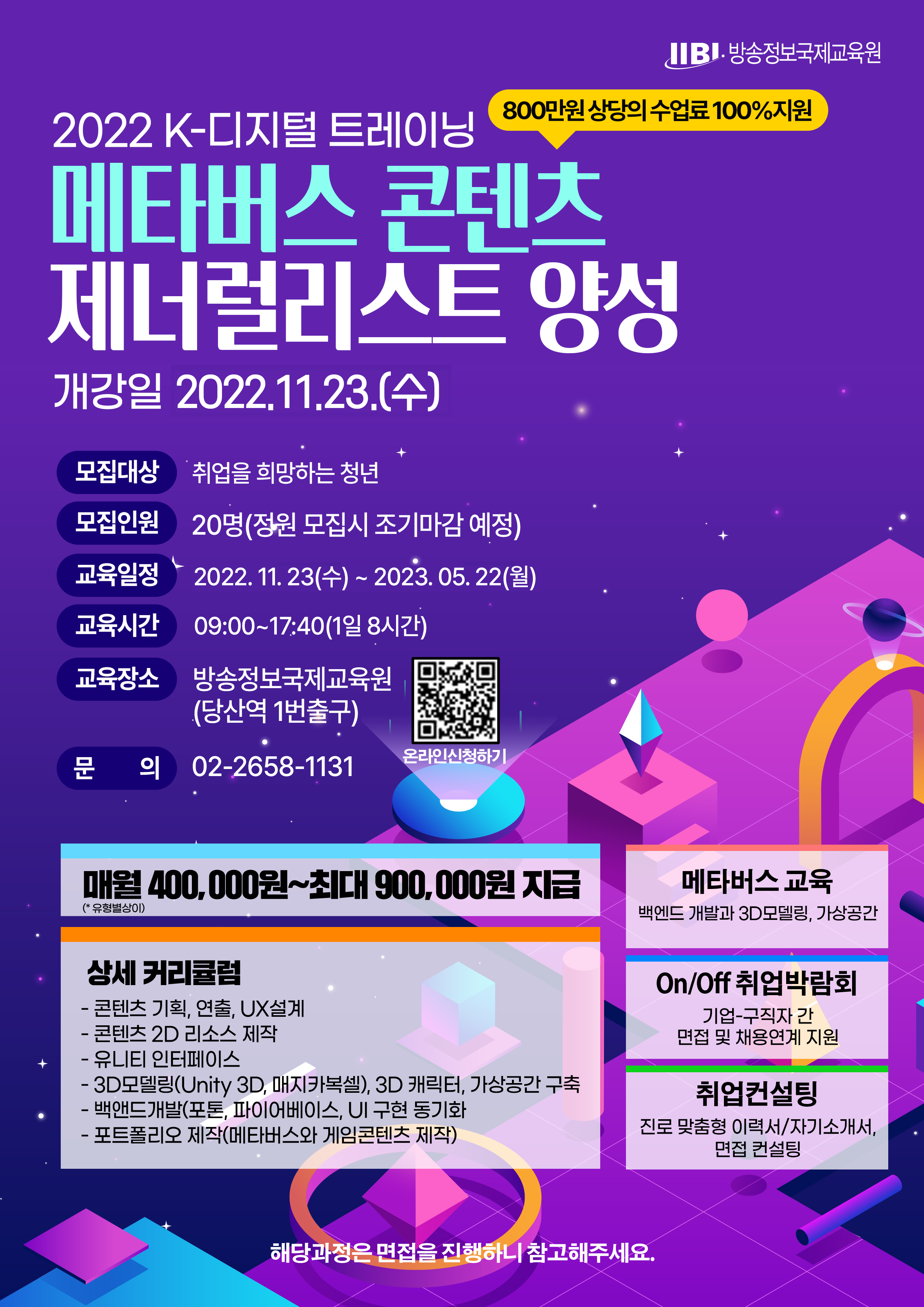 ● 모집개요 800만원 상당의 수업료 100% 지원! 매월 최대 90만원까지 지급! K-디지털트레이닝은 4차 산업 시대에 중요한 디지털 분야로의 취업을 희망하는 비전공 청년들의 취업을 위해 훈련 과정을 제공하는 취업제도입니다.