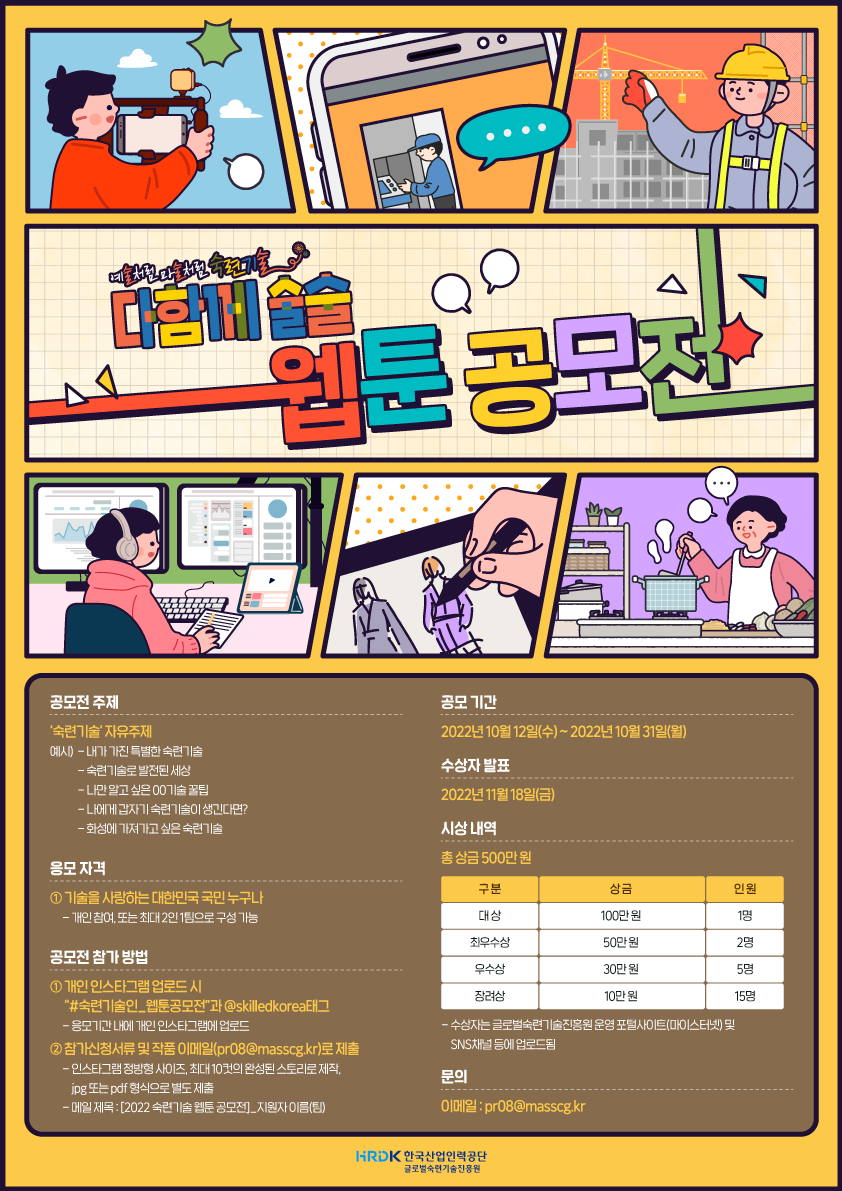 ● 공모개요 '숙련기술'하면 무엇이 생각나나요? 내가 가진 기술을 자랑하고 싶기도 하고, 기술에 대한 꿀팁 공유, 만약 나에게 부족한 기술이 있었더라면 하는 생각 등 한 번쯤은 해본 적이 있으실 텐데요, 숙련기술에 대한 이야기를 재미있는 웹툰으로 소개해 주세요\~ 남녀노소 누구나 참여 가능하답니다 :)