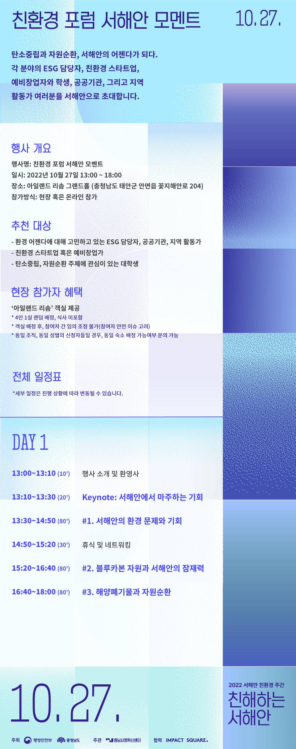 본 행사는 2022 서해안 친환경 주간 "친해하는 서해안"의 일환으로 열리는 "친환경 포럼 서해안 모멘트"로, "그린어스 캠핑 페스티벌", "블루어스 플로깅", "서해안 도보 생태체험", "서해안 기술 워크숍"과 더불어 진행됩니다. 자세한 행사 내용은 충남사회혁신센터 홈페이지와 dearseohaean.kr 홈페이지에서 확인해주시기 바랍니다.