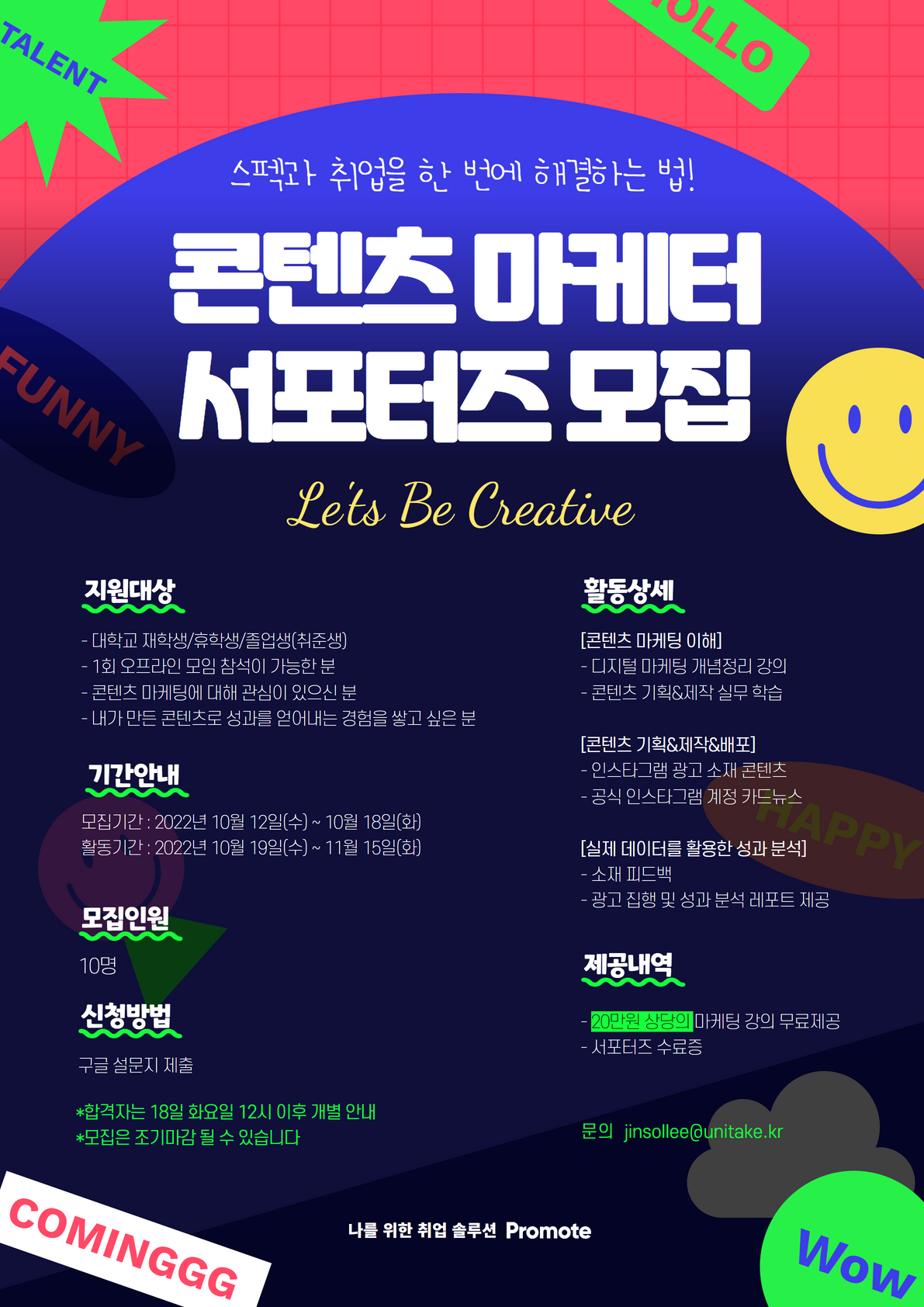 [응모주제] ‘나’ 맞춤형 취업 솔루션, 프로모트에서 콘텐츠 마케터 서포터즈를 찾습니다! 🤨나는 마케터와 잘 맞을까? 😲마케터는 어떻게 콘텐츠를 기획할까? 🤔마케터는 무슨일을 할까? 한 번쯤 이런 고민을 해보셨다면 이제 해결할 차례! 이번 콘텐츠 마케터 서포터즈에 참여하면 직접 콘텐츠를 제작하고, SNS광고를 집행합니다. 마케팅 비용은 전액 지원하며, 데이터를 바탕으로 인사이트를 쌓아보는 경험을 해보실 수 있습니다. 포트폴리오 제작과 첨삭, 콘텐츠 피드백까지 모두 얻어갈 수 있는 기회를 놓치지 마세요!