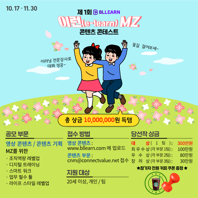 4. MZ를 위한 업무 필수 툴 ex) 엑셀, PPT, 워드, 한글, 포토샵, 프리미어, 애프터 이팩트 등 5. MZ를 위한 라이프 스타일 레벨업 ex) 뷰티 메이크업, 패션 스타일링. 1인가구 정리 수납, 1인가구 건강 레시피, 생활 스포츠, 자동차, 웹툰, 경제상식, 레시피, 리빙잇템, 문학, 역사, 철학, 동양화, 서양화, 디자인, 악기 등 ● 시상 내역 및 혜택 1. 시상 내역 - 대상 (1팀) : 300만원 - 최우수상 (총 2팀 / 각 부문 1팀) : 100만원 - 우수상(총 4팀 / 각 부문 2팀) : 80만원 - 장려상(총 6팀\, 각 부문 3팀) : 30만원 2. 참가자 전원 혜택 - 스타벅스 기프티콘 증정\, 강사역량강화 이러닝(15만원 상당) 제공 - 케넥트밸류의 AI 큐레이션 플랫폼 Bllearn(블런)\, 커넥트러닝 환급과정 등 관련 사이트 등록\, 유료 학습자료로 판매 기회 제공\, 이러닝 콘텐츠 판매 금액의 80% 수익 지급 - 이러닝 전문 강사 데뷔 - 커넥트밸류 메인페이지 강사 프로필 홍보 - 오프라인 강의 섭외 우선권 (단, 지원 시 서류 미제출 혹은 서류기입사항 불성실 기재, 미 기재시 전원 혜택에서 제외됨) ● 응모 일정 - 2022. 10. 17(월) \~ 11. 30(수) 약 7주 간 (세부일정 홈페이지 참조) ● 제출 방법 [영상 콘텐츠 부문] 1. 영상 분량 : 최소 5차시 이상의 자체 제작 이러닝 콘텐츠 (각 차시 10분 내외) ( 6차시 이후 영상이 아직 제작되지 않았을 경우, 6차시 이후는 시나리오 or 교안으로 제출 가능) 2. 영상 접수방법 : www.bllearn.com에 판매 가능한 상태로 업로드 시나리오or교안 제출방법 : 이메일 제출 cnm@connectvalue.net - 블런 사이트 내 이러닝 콘텐츠 업로드 안내 3. 제작 시 참고 사항 - mp4 권장\, 강의형식 자유\, 후반작업 및 편집 완료본\, - 타 플랫폼 판매중인 콘텐츠 접수 가능 (단\, 권리 침해로 인한 법적 위험이 전혀 없어야 함) [콘텐츠 기획 부문] 1. 제출 서류 : 전체 교육과정 개요 / 차시별 교안 / 차시별 스크립트 - 한글\, 워드\, PPT 권장 - 1차시 영상 콘텐츠 제출 필수 (무편집 제출 가능)