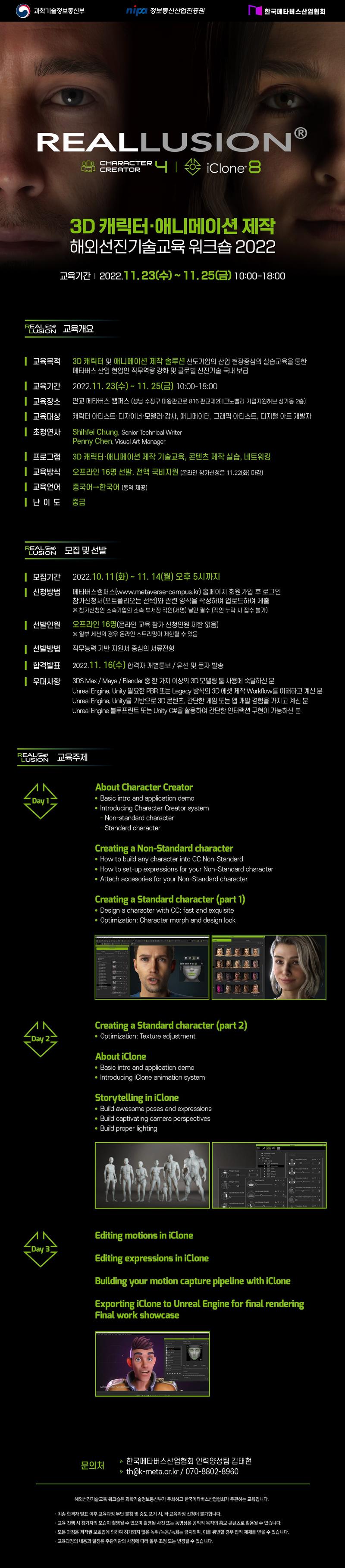 < Reallusion 3D 캐릭터 · 애니메이션 제작 워크숍> 교육 신청은 홈페이지에서만 정상 접수됩니다. 수강신청 페이지 이동 본 과정은 서류 심사를 통해 선발됩니다.