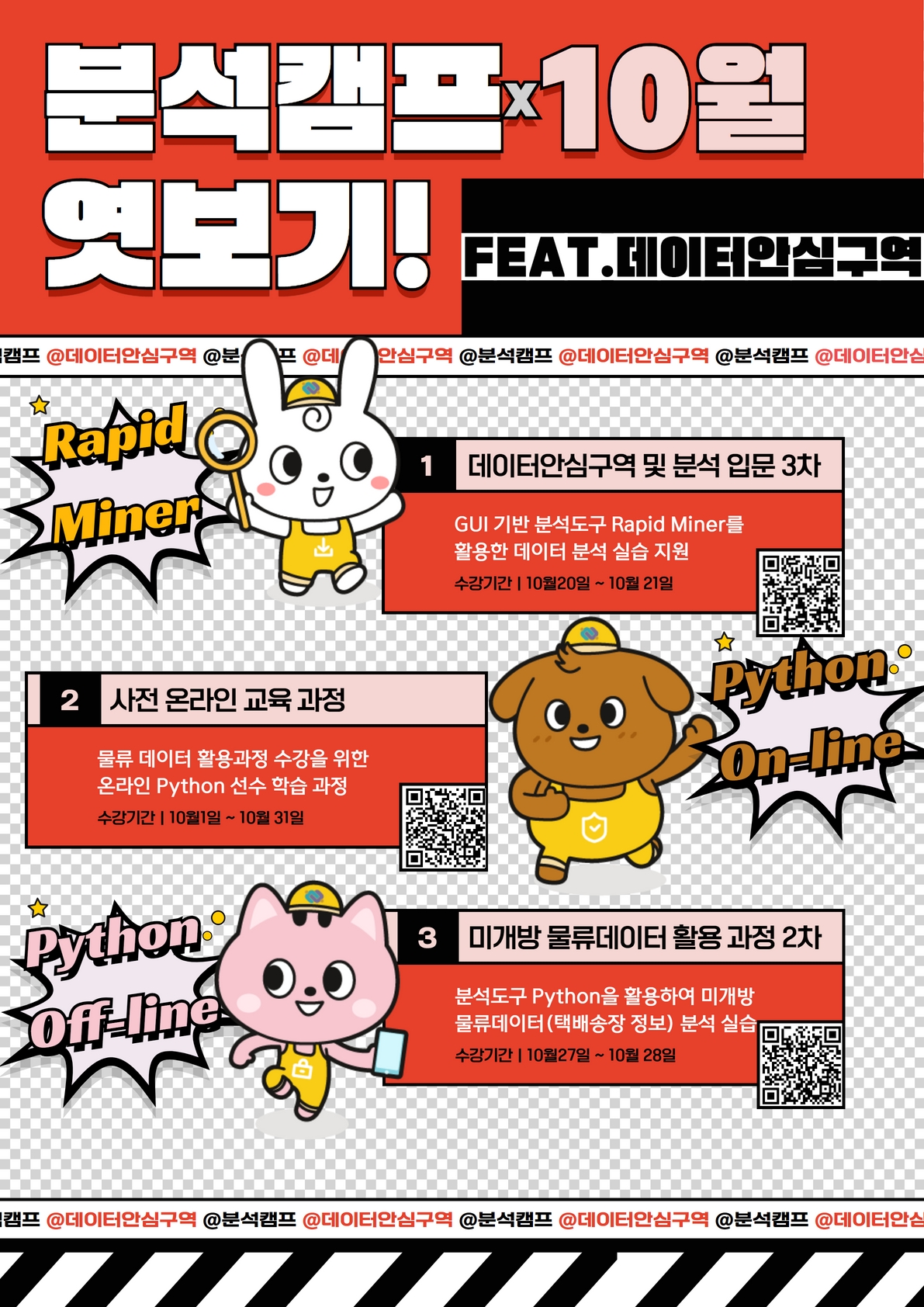[미개방 물류데이터 활용 과정] 교육기간 : 10월 27일(목)\~28일(금), 9:30\~17:30 교육장소 : 한국데이터산업진흥원 (서울시 중구 소재) * 교육비 전액 무료 및 한국데이터산업진흥원장 명의 수료증 제공