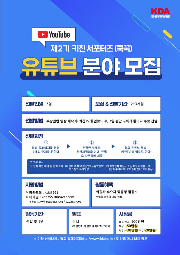안녕하세요? 키친, 외식분야 유튜브에 자신있거나 관심있는 분 환영합니다. 공모전을 통해 시상을 통해 선발합니다. 지역에 관계없이 활동가능합니다.